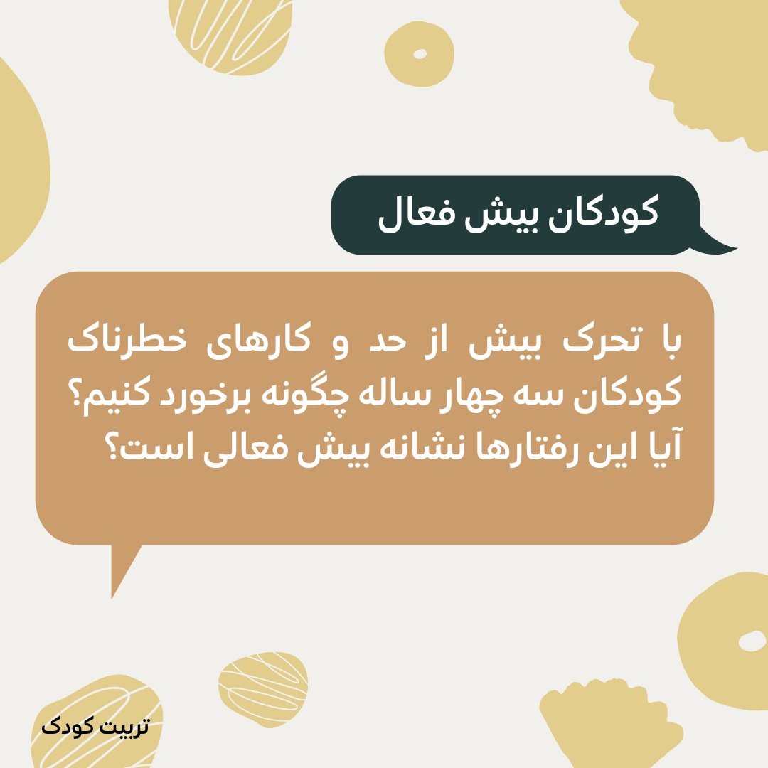 روانشناس نمی تواند قبل از سن ۴ سالگی تشخیص #بیش_فعالی بدهد. بعدها هم اگر چنین تشخیصی بدهند، بیش فعالی به مرور زمان تا حد زیادی بهتر می شود و بخش کمی از آن ممکن است باقی بماند که اسم #اختلال به خود می گیرد. در سنین ۴-۳ سالگی هر قدر پدر و مادر بیشتر کودک را #تکریم کنند، در #آغوش بگیرند، ببوسند و به او #محبت کنند، احتمال اینکه رفتارهای کودک اصلاح بشود بیشتر می شود. به این منظور، محبت کردن به این کودکان پرتحرک، باید مکرر و زیاد در طول روز انجام شود که تفاوت واضحی با وضعیت عادی داشته باشد. در مورد کارهای خطرناک کودک گاهی لازم است #تنبیه کوچکی صورت بگیرد، مانند #محروم شدن از چیزی، به اتاق رفتن و فکر کردن، #ترشرویی والدین و...، این کارها در کنار محبت شدید و زیاد می تواند کمک کننده باشد. #تربیت_کودک #پرسش_و_پاسخ