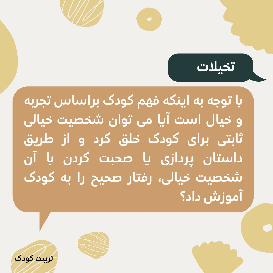 به صورت موردی می شود این کار را کرد. ولی تکرار آن و یا تاکید بر آن درست نیست و ممکن است موجب تثبیت کودک در بعد #خیال گردد. توجه به فعال بودن #قوه_تخیل در این سنین ما را به این مهم می رساند که می توان #بازی هایی طراحی کرد و یا بر روش هایی ارتباطی تاکید نمود که با استفاده از خیال موجب تأدیب #نطق کودک شود. بایستی توجه شود که #تخیلات و #تصویرسازی های والدین در بخشی از دوره اول رشد برای کودک واقعی تصور می شود. از این رو لازم است به وسیله ساختن شخصیت های خیالی برای #تهدید یا ترساندن کودک از چیزی یا انجام ندادن کاری، تخیلات #اضطراب آمیز برای او ایجاد ننموده و زمینه بروز #ترس های اختلال زا را در او ایجاد نکنیم. #تربیت_کودک #پرسش_و_پاسخ