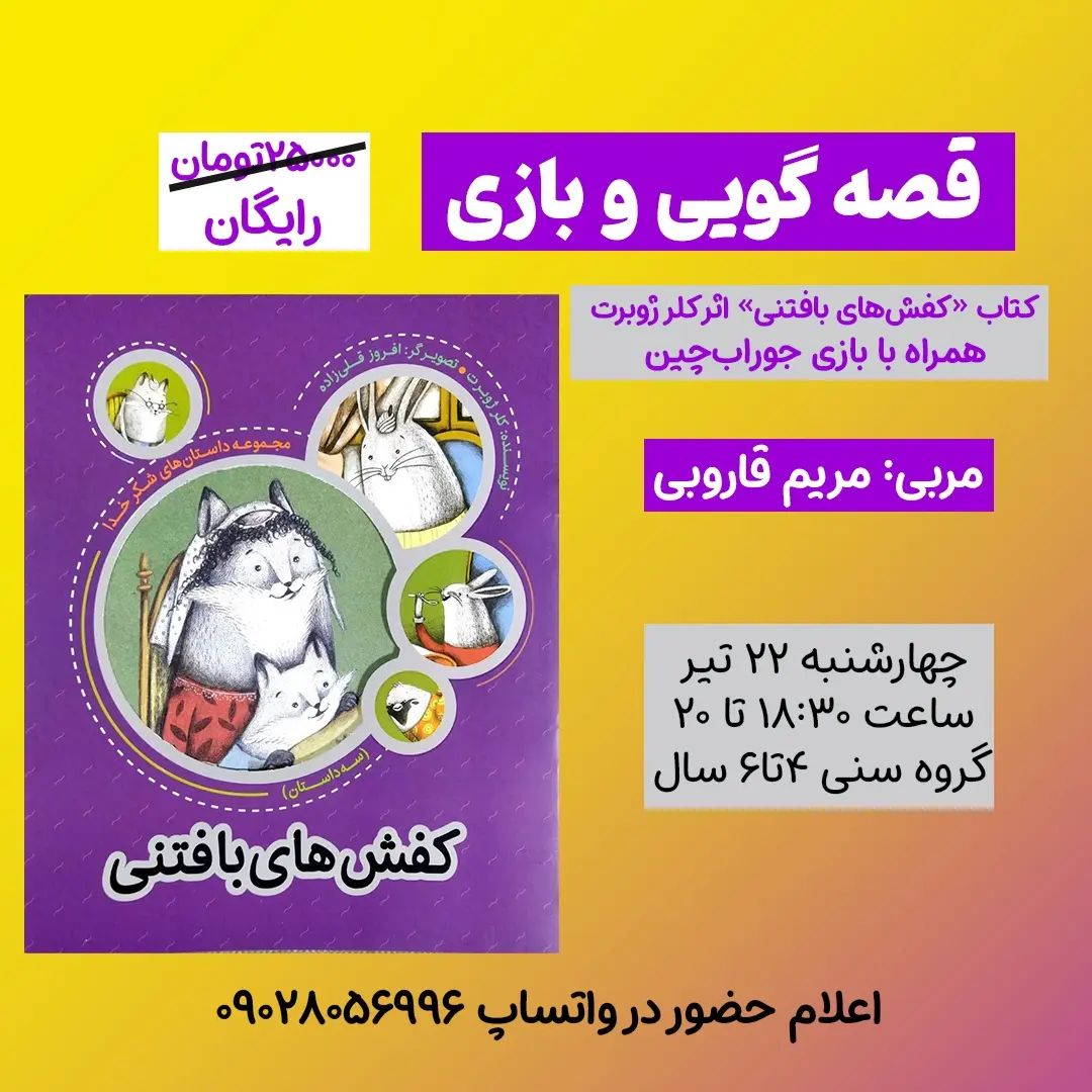 منتظرتونیم !🥳 👇 چون ظرفیت محدوده حتما برای ثبت نام به شماره پیام بدید❗ با مربیگری خانم قاروبی @maryamb0ok 📘در این کارگاه کتاب میخوانیم؛ کتاب «کفشهای بافتنی» اثر خانم کلر ژوبرت ✏️بعد از کتاب خوانی بازی میکنیم بازی جورابچین🧦🧦 ◽کِی؟ چهارشنبه ۲۲تیر ◾ساعت چند؟ ۱۸:۳۰ تا ۲۰ ◽گروه سنی؟ ۴ تا ۶ سال ◾کجا؟ ابرک☁️ ابرک کجاست ؟ 📌قم، پردیسان ، سبلان ۱۲ شماره واتساپ برای قطعی کردن حضور 09028056996 ☁️☁️☁️☁️☁️☁️☁️☁️🌩️⛈️🌧️🌦️🌨️🌩️🌩️ #کفش_های_بافتنی #قصه #کلز_ژوبرت #قم #پردیسان #ابرک