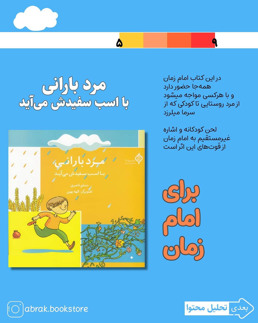 مرد بارانی با اسب سفیدش میآید. با آمدنش هوا خوش میشود، غمها میروند، جویبارها شادمان میروند بلبلها بدون واهمه آواز میخوانند. شاید تو هم مرد بارانی را دیده باشی. از جمله اهداف این متن، ایجاد حس انتظار موعود، بدون القای مستقیم مفاهیم است. نویسنده سعی کرده مستقیم گویی نکند، تا اثر نوشته اش بیشتر باشد. 💵قیمت: 10هزارتومان ✔️برای سفارش کتاب دایرکت بدهید نویسنده: مسلم ناصری تصویرگر" الهه بهین انتشارات: شبنم این کتاب ناداستانی است که از چند قطه تشکیل شده است. عناوین قطعات این کتاب: مرد بارانی تنها نیست، یک سبد سیب، مرد بارانی و دخترک تنها، مرد بارانی و چشمه، مرد بارانی و بره، یک جفت پوتین گرم، شهر دودگرفته، مرد بارانی گریه می کند، تپه های سبز. 🌧️🌧️🌦️🌧️🌧️ @abrak.bookstore @abrak.bookstore #مسلم_ناصری #امام_زمان #نیمه_شعبان #کتاب_کودک #حضرت_مهدی #جمکران #کتاب #انتظار #معرفی_کتاب #کتاب_مذهبی #معرفی_کتاب_کودک #کتاب_مذهبی_کودک #ابرک