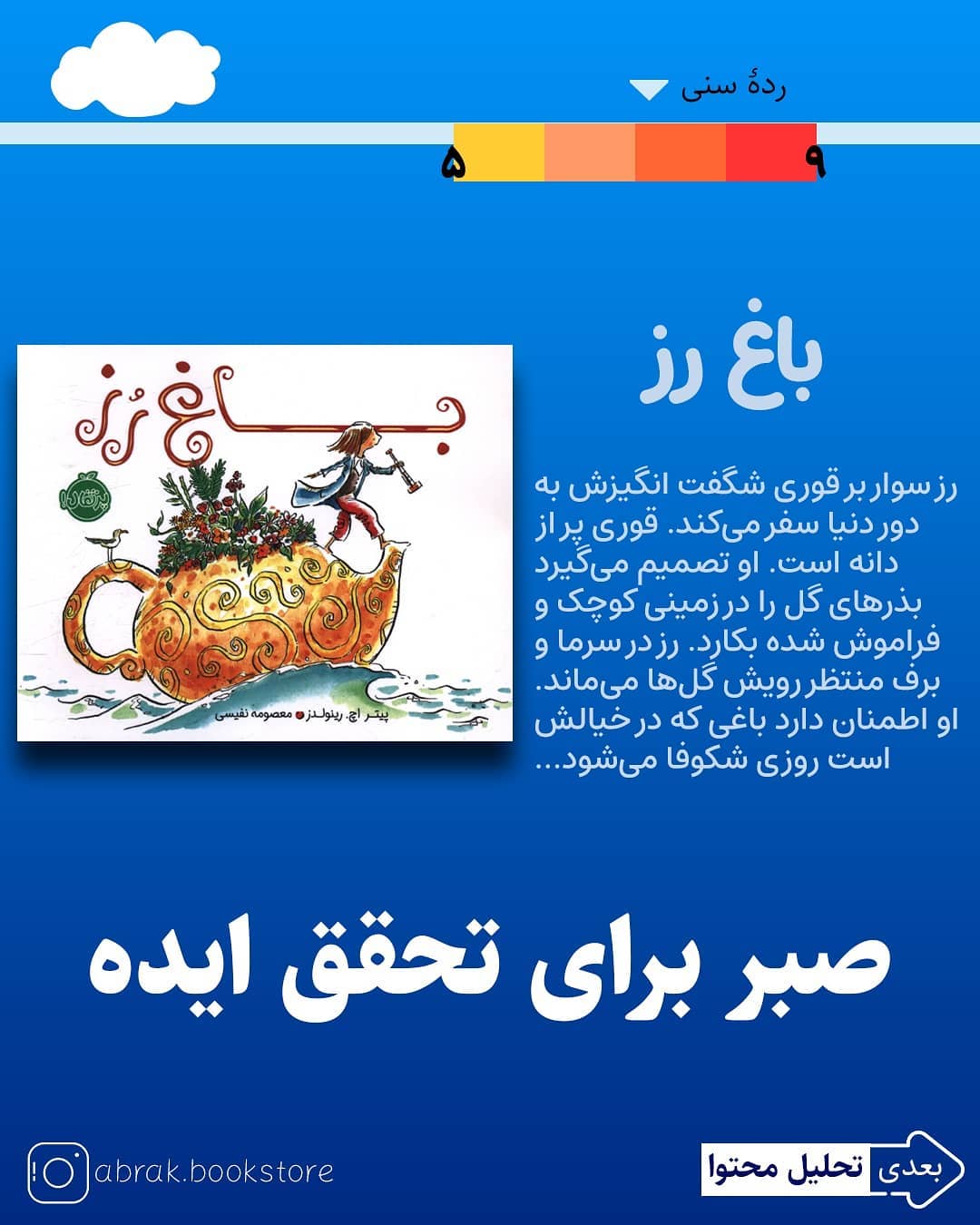 🌧️رُز سوار بر قوری شگفتانگیزش به دور دنیا سفر میکرد تا به سرزمینی رسید که احساس کرد آنجا میتواند خانهاش باشد. او دانهی گلهایش را در زمینی کوچک کاشت و در باران، سرما و برف انتظار کشید و انتظار کشید و انتظار کشید و هرگز تردید نکرد باغی که در خیالش به تصویر کشیده، روزی شکوفا خواهد شد... 🏅صبوری و امید رز ستودنی است. حتی در شرایط سخت پای ایدهاش میایستد چون به آن ایمان دارد. استقامت برای رسیدن به آؤمان والا باعث حرکت در سایر بچهها میشود و دو باغ شکل میگیرد یکی باغ گل و دیگری باغ کودکانی همدل و امیدوار که به هم کمک میکنند. 📕نام کتاب: #باغ_رز ✏️نویسنده: #پیتر_اچ_رینولدز ناشر: #پرتقال 👫رده سنی: ۵ تا ۹ سال 💵قیمت: ۲۵هزارتومان 📩برای تهیه کتاب دایرکت بدهید ✔️به همراه کاربرگ و راهنمای فکرورزی رایگان😍 🔔تحلیل محتوای کتاب را در اسلایدهای داخلی ببینید @abrak.bookstore @abrak.bookstore 🌦️🌧️🌧️🌧️🌧️ #کتاب_کودک_خوب #کتاب_کودک #کتاب #محیط_زیست #پرتقال #پیتر_رینولدز #تربیت_کودک #کودک_خلاق #کودک_محیط_زیستی #کتاب_کودک_نوجوان #کودک #نوجوان #کتابخانه #کتابخوانی #کودک_کتابخوان #معصومه_نفیسی #انتشارات_پرتقال