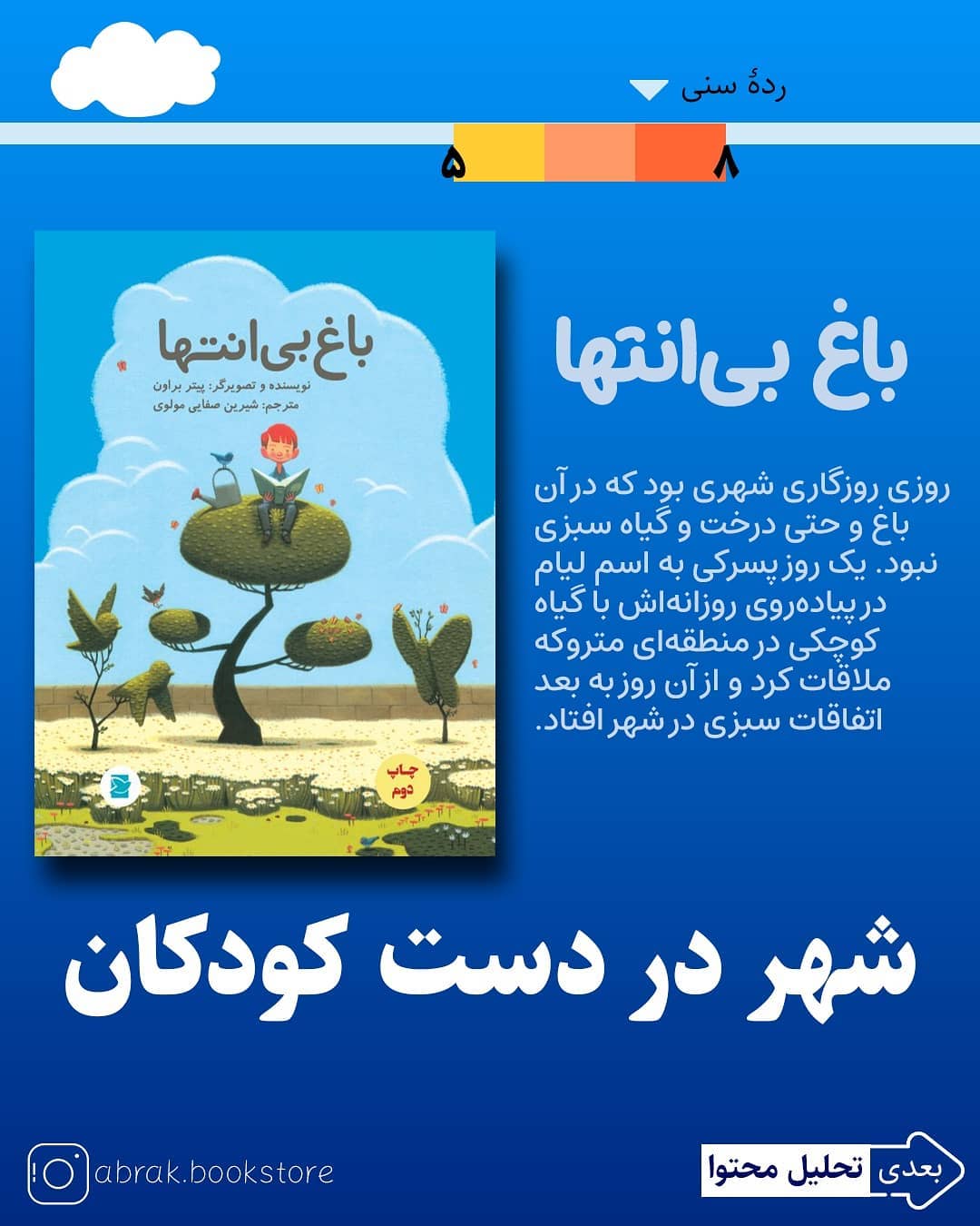 پسر کنجکاو، یک باغ کوچک تنها، وقتی این ها وسط یک شهر بی روح به هم برسند چه اتفاقی میافتد؟ همان اتفاقی که برای باغ بی انتها افتاد. باغ بی انتها داستانی است درباره رویای یک پسربچه؛ داستانی که نشان می دهد چگونه کوشش پسری کوچک ممکن است به تغییرات بزرگ در دنیا کمک کند. 📕نام کتاب: #باغ_بی_انتها 👫رده سنی: ۵ تا ۸ سال 💵قیمت: ۲۵هزارتومان 📩برای تهیه کتاب دایرکت بدهید ✔️به همراه کاربرگ و راهنمای فکرورزی رایگان😍 🔔تحلیل محتوای کتاب را در اسلایدهای داخلی ببینید! نویسنده: #پیتر_براون مترجم: شیرین صفایی مولوی ناشر: #پرنده_آبی @abrak.bookstore @abrak.bookstore 🌧️🌧️🌧️🌧️🌧️🌧️🌧️ #کتاب #ابرک #کودک #کتاب_کودک #انتشارات_علمی_فرهنگی #محیط_زیست #باغ #کتاب_خوب #درختکاری #شهر_پاک #آلودگی_هوا #گل #گیاه #کنشگری #کاربرگ #معرفی_کتاب #معرفی_کتاب_کودک #تحلیل_کتاب #کتابفروشی #کتابفروشی_کودک #محیطزیست #کتاب_کودک_خوب #کتاب_بخوانیم #شیرین_صفایی_مولوی