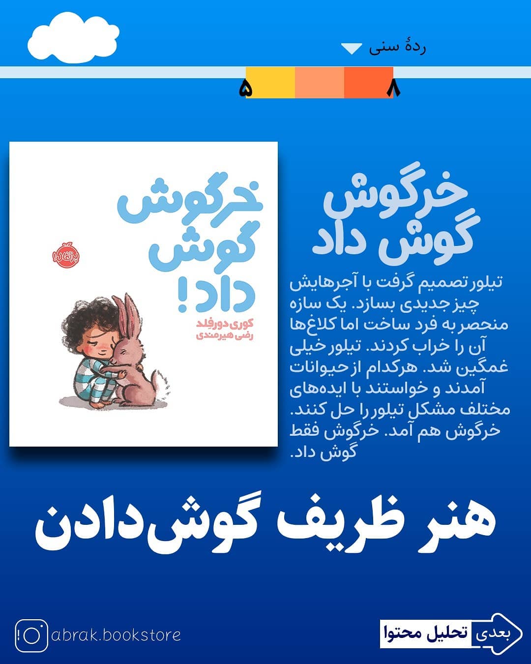 تیلور با مکعبهای خانهسازیاش ساختمان فوقالعادهای ساخته بود. همینطور که داشت با افتخار ساختمانش را تماشا میکرد، یکدفعه یک دسته کلاغ به ساختمانش زدند و آن را خراب کردند. حیوانات جنگل که این صحنه را دیدند، همهشان فکر کردند میتوانند حال تیلور را خوب کنند. آنها یکییکی آمدند و با تیلور صحبت کردند. اما تیلور حالوحوصلهی هیچکدامشان را نداشت. هیچکدامشان واقعاً بلد نبودند حال تیلور را خوب کنند؛ تا اینکه خرگوش از راه رسید... 📕نام کتاب: #خرگوش_گوش_داد نویسنده: #کوری_دورفلد مترجم: #رضی_هیرمندی ناشر: #پرتقال 👫رده سنی: 5 تا 8 سال 💵قیمت: 39هزارتومان 📩برای تهیه کتاب دایرکت بدهید ✔️به همراه کاربرگ و راهنمای فکرورزی رایگان😍 🔔تحلیل محتوای کتاب را در اسلایدهای داخلی ببینید @abrak.bookstore @abrak.bookstore 🌧️🌧️🌧️🌧️🌧️🌧️🌧️ #کتاب_کودک #کتاب #معرفی_کتاب #معرفی_کتاب_کودک #پیشنهاد_کودک #خرگوش #گوش #کودک #نیاز_کودک #لگو #کتاب_طنز #کتاب_کودک_خوب #کتابخوانی #کتاب_طنز_کودک
