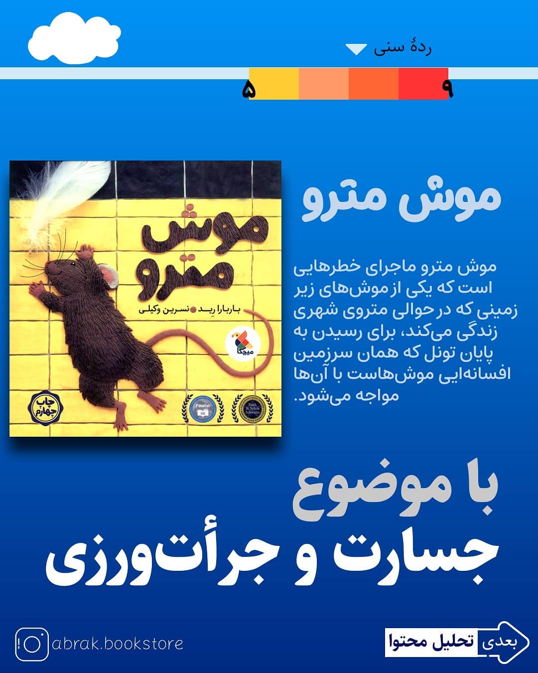 نیب موش کوچولویی است که در ایستگاه متروی شهری زندگی میکند. شبها قصه سرزمین افسانهای بیرون تونل را از موشهای پیر میشنود. سرزمینی گرم و نرم و زیبا اما با هیولاهای ترسناک. یک روز نیب راه سفر میشود تا ببیند پایان تونل به کجا میرسد و در مسیر با خطرهایی روبرو میشود. 🏅نامزد جایزه ادبی گاورنر جنرال 2003 🏅برنده جایزه راث سیلویا شوارتز 2003 🏅 برگزیده فهرست IBBY-2004 🏅برنده جایزه شورای هنر کانادا 200 ✔️تصویرهای کتاب، هنر مجسمه سازی نویسنده است که همراه با متن، داستانی دلنشین خلق کردهاند 📕نام کتاب: #موش_مترو ✏️نویسنده: #باربارا_رید ناشر: #میچکا 👫رده سنی: ۵ تا ۹ سال 💵قیمت ۳۸هزارتومان 📩برای تهیه کتاب دایرکت بدهید ✔️به همراه کاربرگ و راهنمای فکرورزی رایگان😍 🔔تحلیل محتوای کتاب را در اسلایدهای داخلی ببینید @abrak.bookstore @abrak.bookstore 🌧️🌧️🌧️🌧️🌧️🌧️ #کتاب #کتاب_کودک #جرئت #جسارت_ورزی #کودک_شجاع #موش #مترو #کتابخوانی #کتابخانه #کتابخانه_کودک #کتابفروشی #کودک_و_نوجوان #پیشنهاد_کتاب_کودک #کتاب_کودک_خوب #معرفی_کتاب_کودک #ابرک #زیرگنبدکبود #حل_مسئله #مبتکران #نسرین_وکیلی