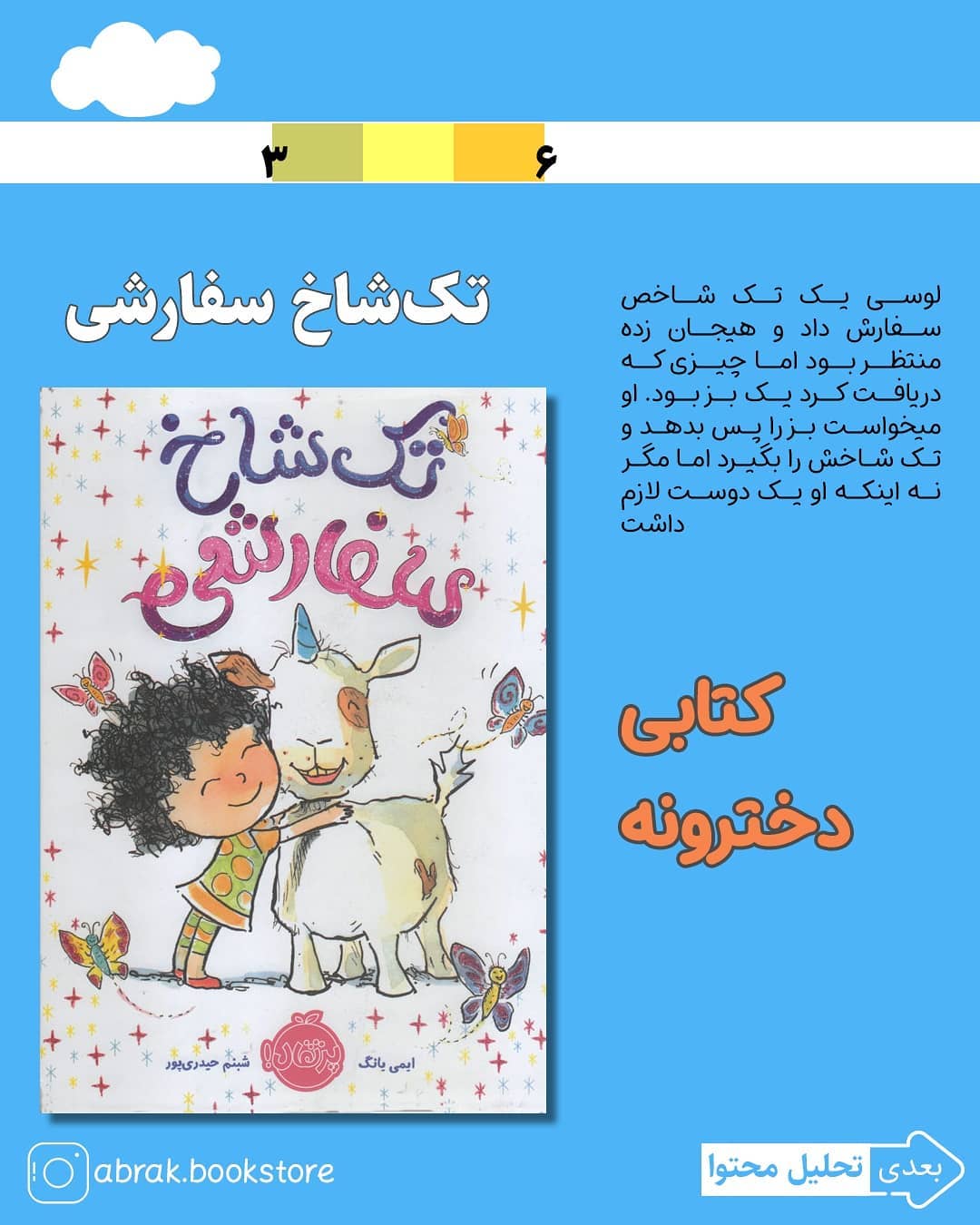 لوسی توی مجله تبلیغی از تکشاخ با قیمت خوب میبینه و سریع پولش رو میده تا تکشاخ رو براش بفرستند. وقتی کامیون سفارشها دم خونهشون میرسه، لوسی با یه کیک به استقبال دوست جدیدش میره اما تکشاخی که فکرش رو میکرد کجا و این دوست جدید کجا! کتاب تصویری «تکشاخ سفارشی» داستان بامزه و جذاب دربارهی دوستی با یه بچهبُز خیلی شیطونه. این داستان بانمک با تصویرهای دوستداشتنیش بهمون یادآوری میکنه که درسته آرزوهامون دقیقا شبیه تصوراتمون برآورده نشن، اما بالاخره برآورده میشن و خوشحالمون میکنند و برای لذت از زندگی، بهتره که قدر داشتههامون رو بدونیم. 💵قیمت: 29000تومان 📩برای تهیه کتاب دایرکت بدهید ⭐به همراه کاربرگ و راهنمای فکرورزی رایگان نویسنده: ایمی یانک ناشر: پرتقال رده سنی: 5تا9 سال #ایمی_یانگ #داستان_کودک #کتاب_کودک #ابرک #کتاب #کتابفروشی_کودک #معرفی_کتاب #معرفی_کتاب_کودک #دختر #دخترونه #تک_شاخ #تکشاخ #پرتقال #کتابفروشی #تک_شاخ_سفارشی #تکشاخ_سفارشی