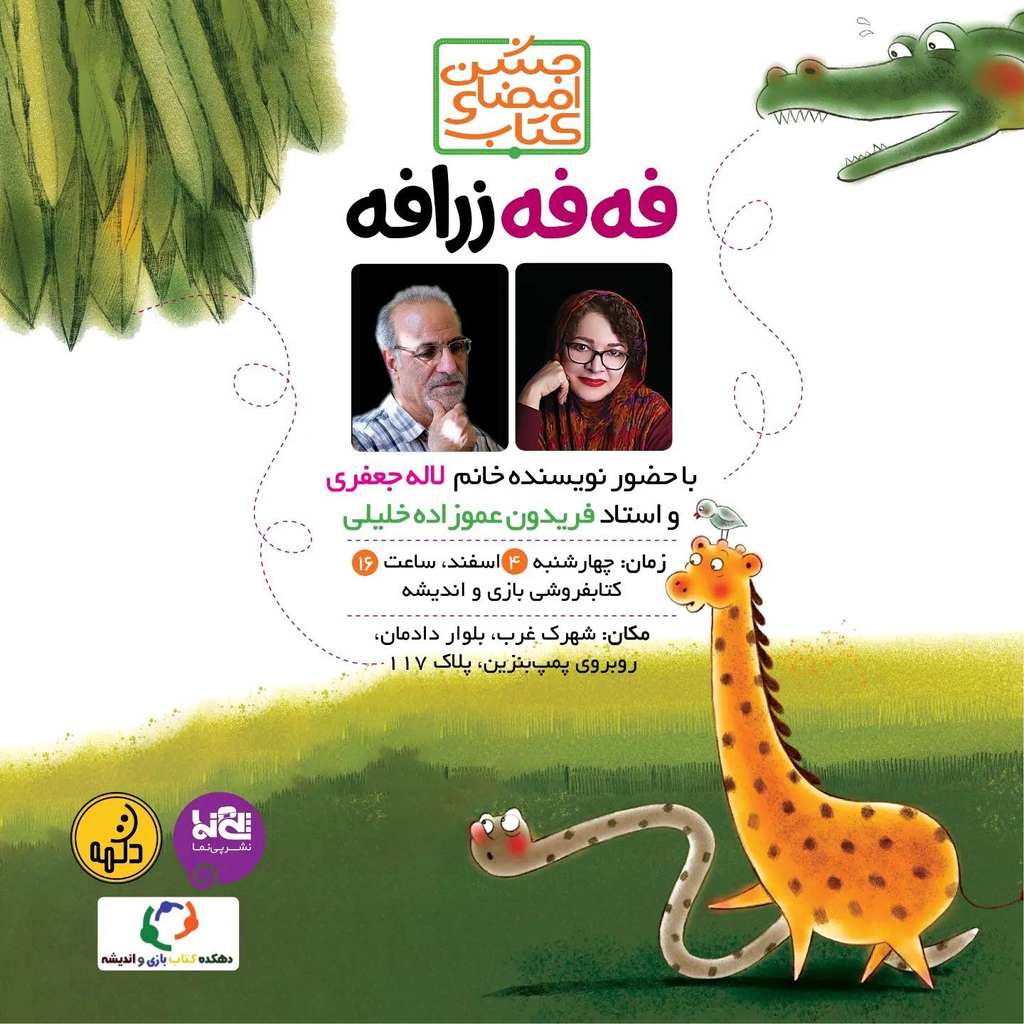 . خبر خبر! برای نامزد نهایی جایزۀ شهید حبیب غنیپور؛ جناب#فه_فه زرافه جشن امضا گرفتیم 🤩💫 با حضور خانم نویسنده #لاله_جعفری و استاد عزیزمون #فریدون_عموزاده_خلیلی 🌱 تشریف فرمایی شما باعث خوشحالی ماست. کتابفروشی بازی و اندیشه، چهارشنبه ۴ اسفند ساعت ۴