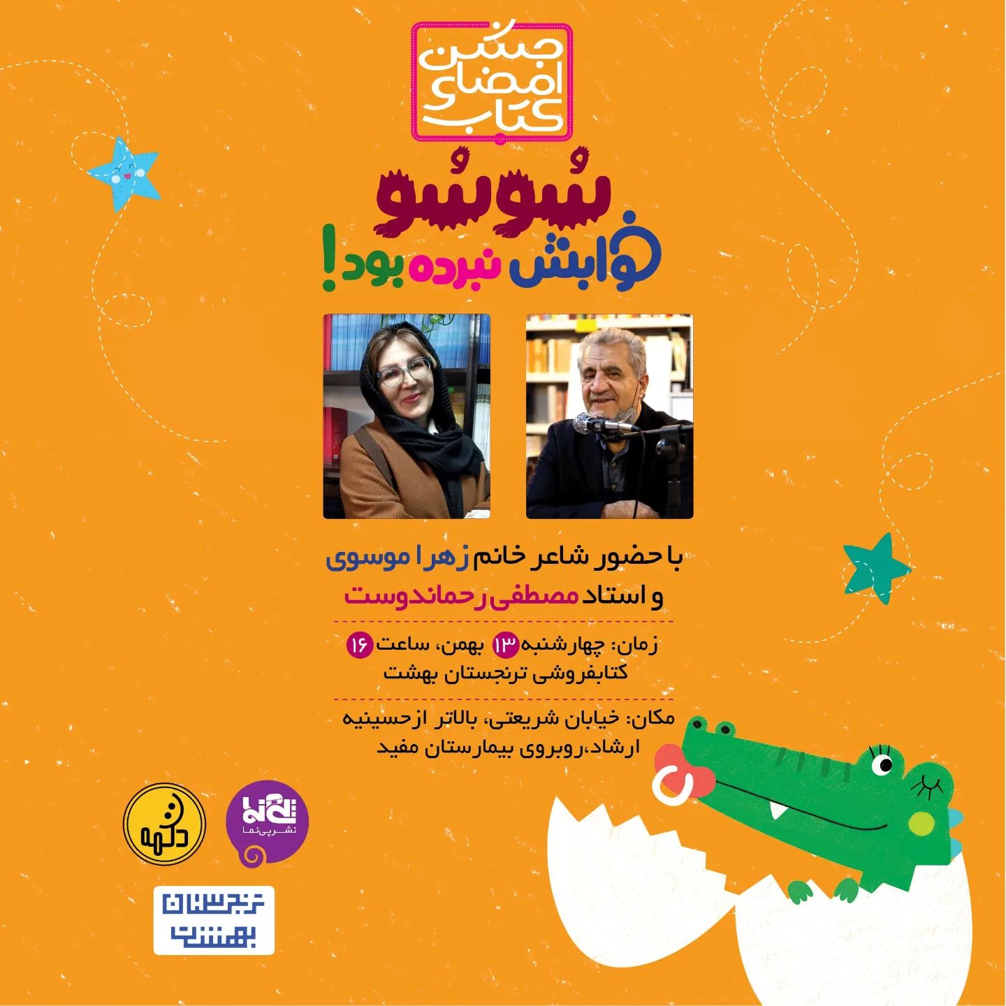 . جشن امضای کتاب #سوسو_خوابش_نبرده_بود 🥳😍 برای دیدار با شاعر کتاب و شنیدن حرفهای شیرین #مصطفی_رحماندوست روز چهارشنبه در کتابفروشی ترنجستان بهشت منتظرتان هستیم🙂🌱 #زهرا_موسوی #کتابفروشی_ترنجستان #ترنجستان_بهشت #جشن_امضا