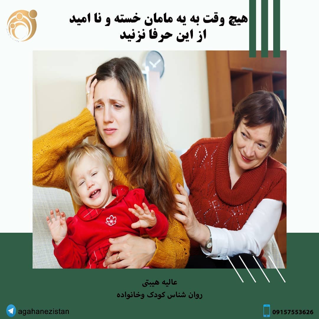 . هیچ وقت به یه #مامان_خسته و نا امید از #فرزند_پروری که با شما درد و دل می کنه از این حرفا نزنید تو که سختی نداری همش تو خونه ای با بچه ها... حالا کجا شو دیدی الان که خوبه بزار بزرگ بشه! ناشکری نکن آنقدر منفی نباش تو به این می گی شرایط سخت، پس شرایط منو ندیدی! خودت خواستی بچه دار بشی 🤔🤔🤔 #درد_دل_مادرانه #تربیت_کودک #مشاوره#انرژی_خوب #فرزندپروری #خراسان_جنوبی_بیرجند