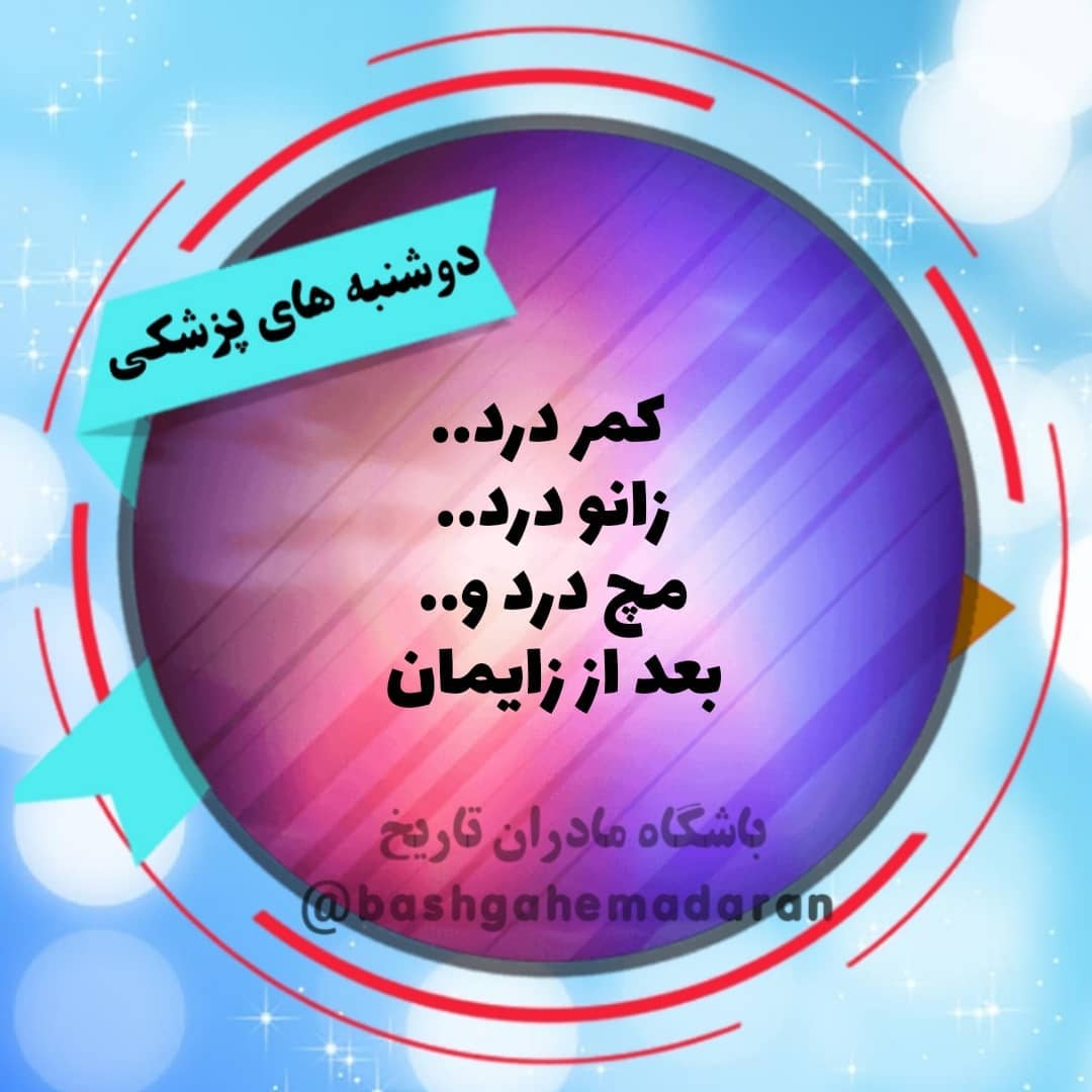 بسم الله زانودرد، مچ درد، کمردرد و... بعد از زایمان ⚠️ درد مفاصل بعد زايمان ها چندعلتی میتونه باشه: 1️⃣ عدم تحرک مناسب در بارداری و شیردهی (ضعف عضلات حمایت کننده مفصل و کاهش خونرسانی مفصلی / اصلی ترین علت) 2️⃣ رطوبت و سردی بعد زایمان 3️⃣ عدم تجدید قوا بعد زایمان 4️⃣ نخوردن مکمل ها 5️⃣ فشارهای کاری در امور بچه داری و منزل، مخصوصاً با عدم رعایت ارگونومی (خم و راست شدن های زیاد و نادرست، بغل گرفتن های اشتباه، شست و شوی زیاد نوزاد و...) ❇ درمان: ✅ نرمش منظم روزانه ✅ گرم گرفتن مفاصل ✅ روغن مالی ✅ مکمل کلسیم + دی ✅ مراقبت های بعد زایمان (کاچی، بستن کمر، گرم گرفتن بدن، کاهش شست و شوها و...) ⭕ انواع مکمل کلسیم در بازار هست. نه تنها مارک های مختلف بلکه اشکال دارویی متفاوت از قرص تا کپسول و شربت و قرص جوشان. اگر یکی بهتون نمیسازه مارک و شکل دیگه امتحان کنید. گروه پزشکان سپیدار https://ble.ir/pezeshki_bashgah باشگاه مادران تاریخ *کپی و نشر فقط با ذکر نام و لینک کانال مجاز است* #دوشنبه_های_باشگاه #دوشنبه_های_طبیبانه #گروه_پزشکان_سپیدار #زایمان #کمردرد #پادرد #مچ_درد #زانو_درد #مکمل #کلسیم #