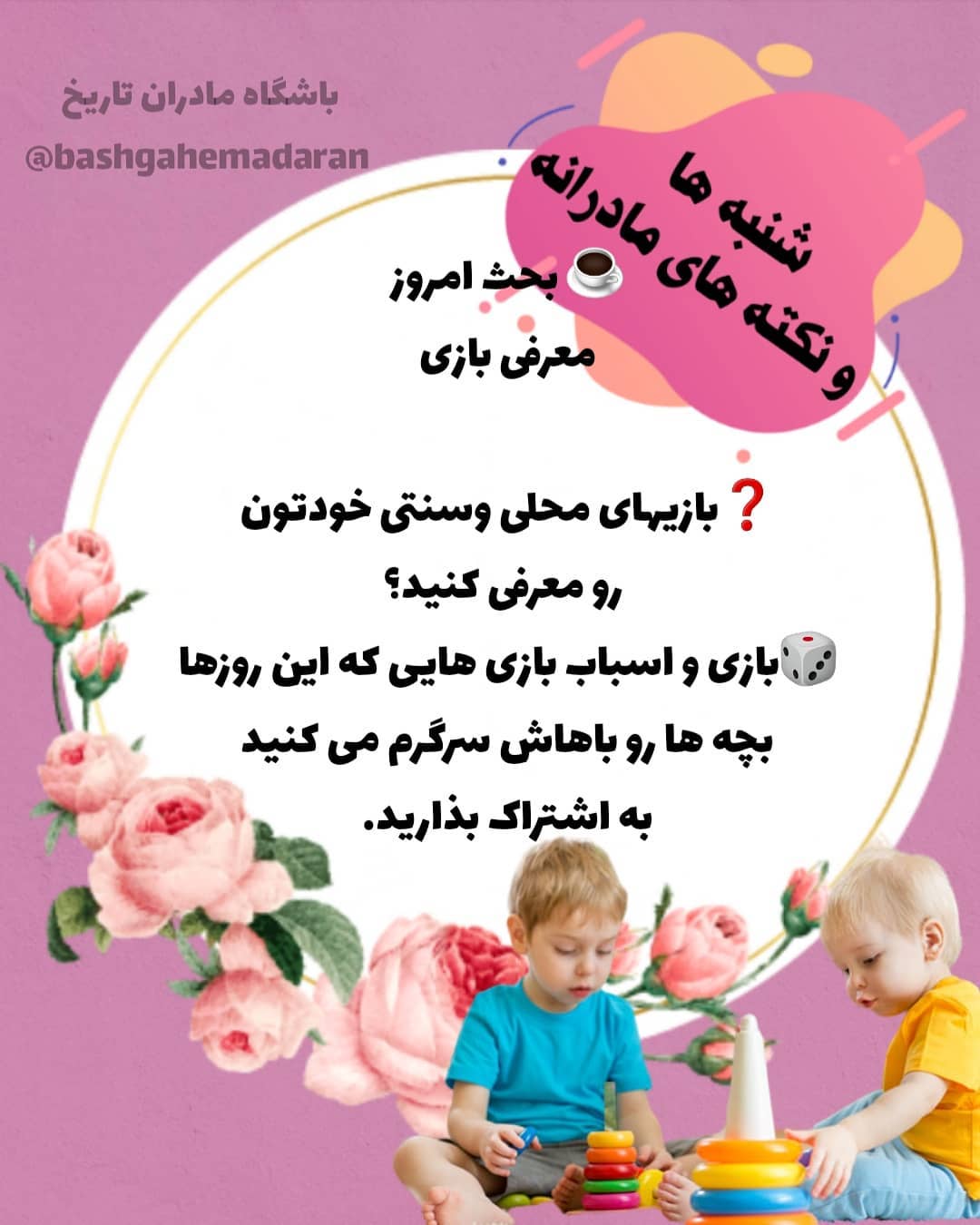 بسم الله تابستان که شده.. کرونای منحوس هم که هنوز باقی هست و نمیشه بیرون از خونه رفت... اکثرمون هم که مامان هستیم.. و حداقل یکی دوتا بچه فسقلی تو خونه داریم.. چه کنیم که بچه هامون حوصلشون سر نره؟🤔 چه کنیم که تو این وضعیت نشاط و پویایی شون حفظ بشه؟😊 از جمع بحث های امروز بازی های زیر به دست اومد، اما شماهم برامون بگید چجوری بچه ها رو سرگرم می کنید؟؟🌱 ✅کار با نمد ببره، بدوزه،بچسبونه ✅کار با کاغذ رنگی ببره،بچسبونه ✅اریگامی کنید تو نت زیاده مدل هاش ✅عروسک درست کنید باهم. با پارچه، بانمد، بافتم ✅اب بازی تو حموم، تو اشپز خونه با کاسه و یه سری وسایل خرده ریز ✅ارد بازی الک کنه ، توش وسایل ریز قائم کنی پیدا کنه، باهاش بنویسه نقاشی کنه ✅خمیر بازی همون اردو اب و روغن و نمک یکم بزن خمیر میشه ولی دست ورزی میتونه انجام بده ✅برش کاغذ با قیچی شکل بکش دورشو ببره یا همینجوری ریز کنه ✅نمایش عروسکی پشت میزی مبلی بشینه با عروسک هاش داستان بگه یا خودت این کارو انجام بدی یاد بگیره کلی مفهوم های مختلف و با این کار میتونی براش بگی ✅قصه گویی با کتاب ، از خودت قصه های تخیلی هدفمند ✅یه سری بازی خودش بسازه با راهنمایی خودتون (با وسایل مختلف مثلا پل بسازه ماشین هاشو از روش رد کنه، قطار بسازه و آقای لوکوموتیو ران بشه، کشتی بسازه و ناخدا شه و ولی با تخیل بسطش بده مثلا مبلا بشه دریا یا پتو بشه دریا) ✅آشپزی کنید باهم کیک بپزید هم بزنه موادشو تخم مرغشو بشکنه شیرینی بپزید خمیرشو ورز بده و... ✅بازی های حرکتی عمو رنجبر باف ، دنبال بازی، چشم شو ببندی دنبالت کنه، از اتاق بره بیرون جای وسایل و تغییر بدی بفهمه و.. ✅کتاب داستان بسازید با عکس های کتابهای استفاده نشده، یا نقاشی خودش یا حتی کلاژ ✅انواع مدل نقاشی ابرنگ، ماژیک، مدادشمعی، رنگ انگشتی، رنگ با ماست رنگی ✅کلاژ نقاشی با چسبوندن پارچه، کاموا، پوست شکلات، پوست پسته، گردو، نی و..... ✅بازی های حرف زدنی اسم حیوون بگیم با حرف م شروع بشه ۵تااسم دخترانه بگیم اسم وسایل اشپز خونه رو بگیم و.. ✅۲۰سوالی یه چیزو حدس بزنین بعد اون یکی سوال کنه زندس؟کوچیکه؟خوراکیه؟و... ✅باغبانی، کاشتن هسته میوه ها یا لوبیا و عدس یکمی، و اب دادن و رسیدگی بهش و دیدن رشد یه موجود زنده ✅بازی با توپ کوچیک ها نشونه گیری تو سبد، والیبال، بولینگ طور و.. ✅بازی با وسایل آشپز خونه ✅بازی در قالب نقش ها، پلیس، دکتر، آشپز، معلم، مامان، بابا ✅کاردستی با کارتن و قیچی و چسب #شنبه_های_باشگاه #باشگاه_مادران_تاریخ #معرفی_بازی #بازی #مامان_خلاق #مامان_شاد #کودک_شاد