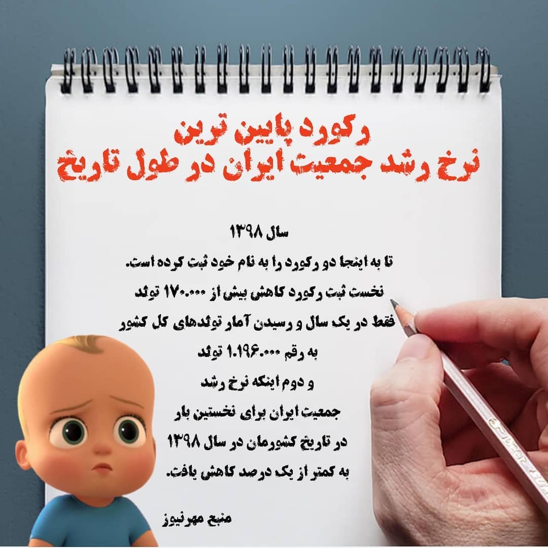 بسم الله رکورد پایین ترین «نرخ رشد جمعیت» در تاریخ #ایران . سال ۱۳۹۸ تا به اینجا دو #رکورد را به نام خود ثبت کرده است. نخست ثبت رکورد کاهش بیش از ۱۷۰.۰۰۰ تولد فقط در یک سال و رسیدن آمار تولدهای کل کشور به رقم ۱.۱۹۶.۰۰۰ تولد و دوم اینکه نرخ رشد جمعیت ایران برای نخستین بار در تاریخ کشورمان در سال ۱۳۹۸ به کمتر از یک درصد کاهش یافت. mehrnews.com/xRQrL #جمعیت #نرخ_رشد_جمعیت #چهارشنبه_های_باشگاه #مباحث_فرزنداوری #باشگاه_مادران_تاریخ