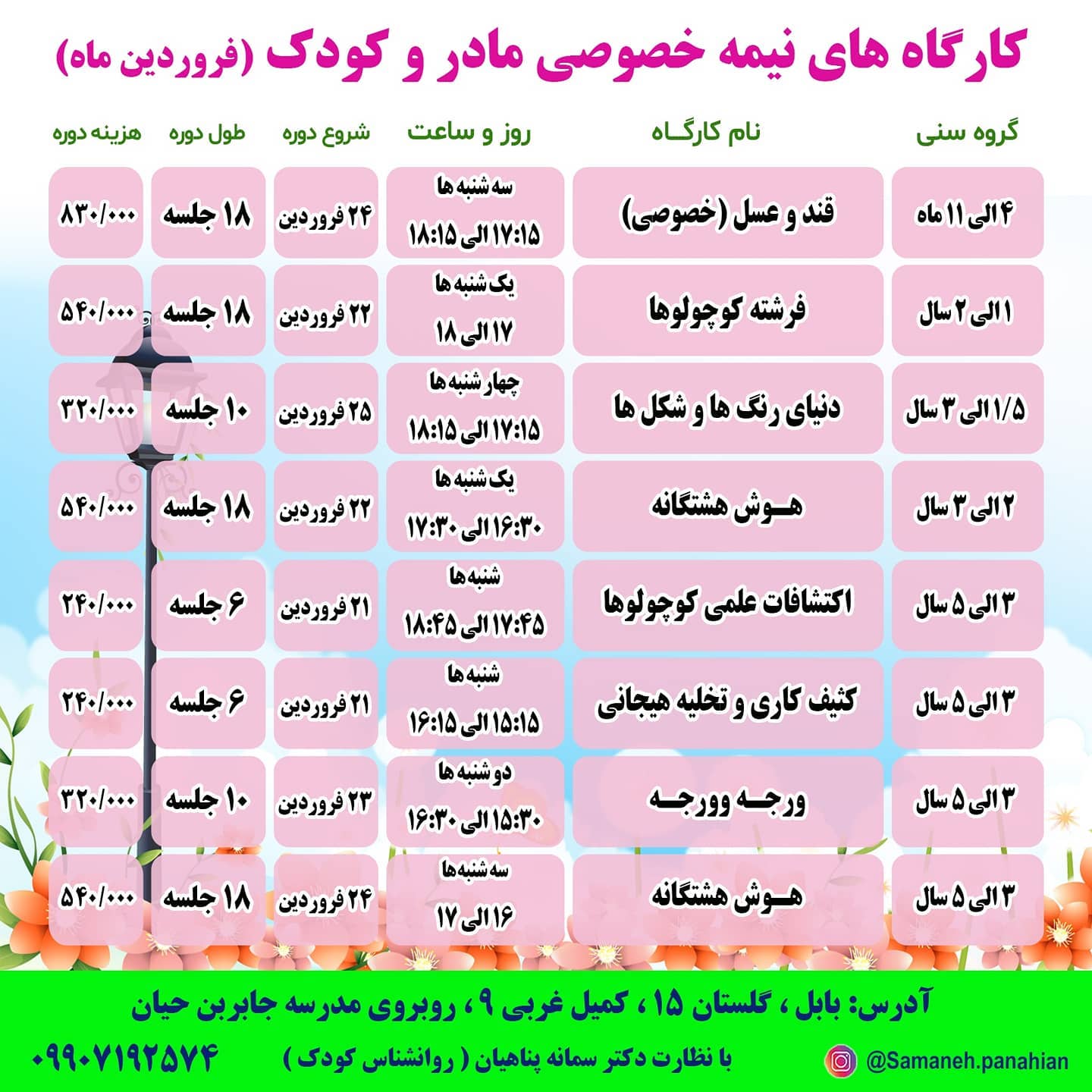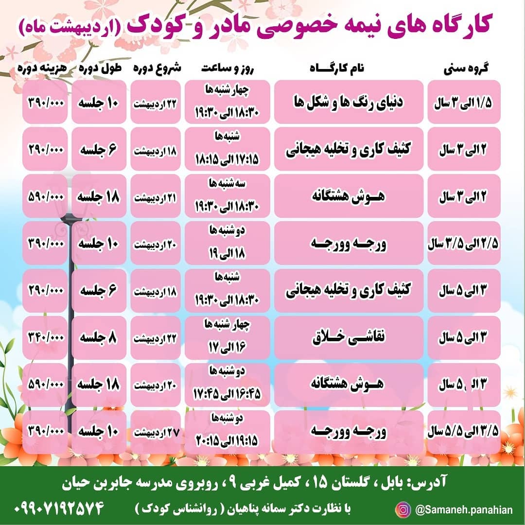 دکتر سمانه پناهیان/ روانشناس کودک و نوجوان اولین برگزار کننده کارگاه های مادر و کودک در استان مازندران آغاز فعالیت از سال 88 مازندران، بابل، کمربندی شرقی، گلستان 15، مجموعه تخصصی روانشناسی کودک و نوجوان