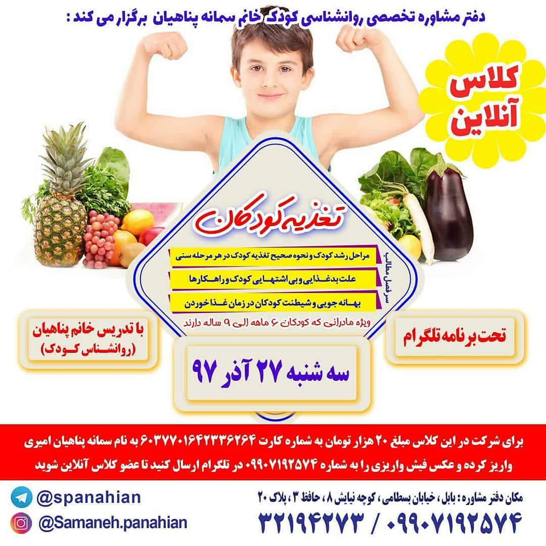 🎊 کلاس آنلاین بعدی👇 🥙 تغذیه کودکان ۶ ماهه الی ۹ ساله 🍗 🍕 کلاس در روز سه شنبه ۲۷ آذر ساعت ۲۲:۳۰ الی ۲۳:۳۰ در برنامه تلگرام برگزار می شود مطالب بصورت تایپ شده به زبان گفتاری در کانالی که مخصوص این کلاس ایجاد می گردد درج می شود. در ضمن نیازی نیست اون ساعت حتما آنلاین باشید، چون هر زمان که آنلاین شوید مطالب هست و اطلاعات برای همیشه باقی می ماند. مطالب کلاس کاملا شفاف و واضح و ۱۰۰ درصد کاربردی و مفید خواهد بود. ✨ برای شرکت در این کلاس مبلغ ۲۰ هزار تومان به شماره کارت ۶۰۳۷۷۰۱۶۴۲۳۳۶۲۶۴ به نام سمانه پناهیان امیری واریز کرده و عکس فیش واریزی را به شماره 09907192574 در تلگرام ارسال کنید تا عضو کلاس شوید. ☎️09907192574 32194273 @samaneh.panahian #سمانه_پناهیان #روانشناس_کودک