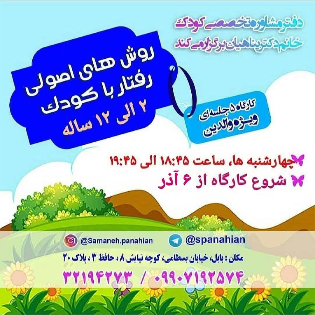 دکتر سمانه پناهیان/ روانشناس کودک و نوجوان اولین برگزار کننده کارگاه های مادر و کودک در استان مازندران آغاز فعالیت از سال 88 مازندران، بابل، کمربندی شرقی، گلستان 15، مجموعه تخصصی روانشناسی کودک و نوجوان