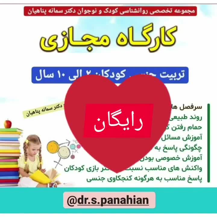 ❤این کارگاه مجازی ( تربیت جنسی کودکان ) به صورت رایگان در برنامه واتساپ ( به صورت ویس و عکس ) برگزار میشه❤ 💓برای اطلاع از شرایط شرکت در کارگاه دایرکت پیام دهید💓 @dr.s.panahian @dr.s.panahian #دکتر_سمانه_پناهیان #روانشناس_کودک_نوجوان #مشاوره_حضوری #مشاوره_تلفنی #مشاوره_آنلاین_تصویری #تربیت_جنسی_کودکان
