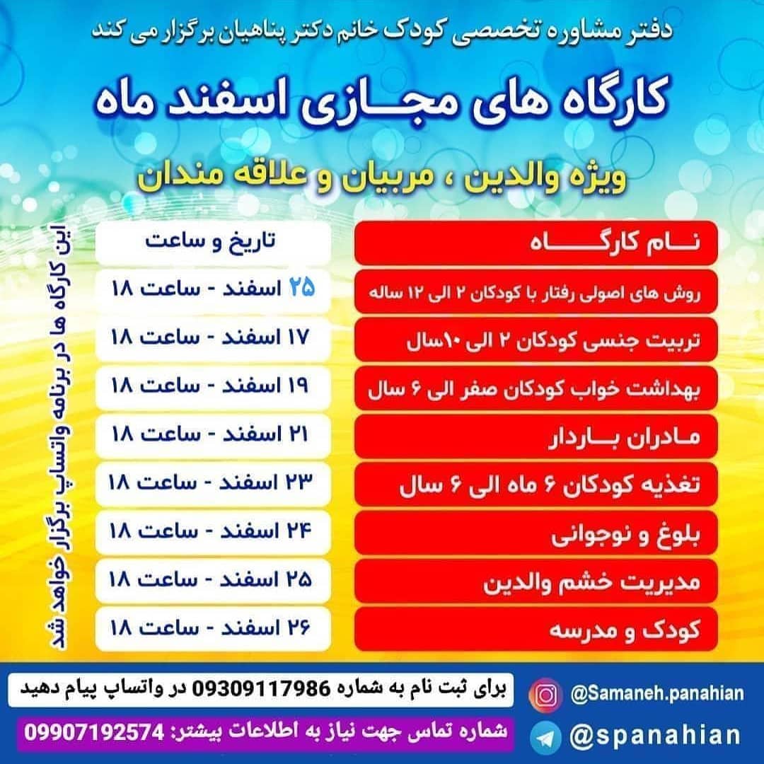 👆 لیست کارگاه های مجازی👆 🛎 کارگاه های مجازی در برنامه واتساپ تشکیل خواهد شد ، مطالب به زبان گفتاری و کاملا شفاف و واضح تایپ می شود و در صورت نیاز با تصویر و فیلم نیز توضیح داده خواهد شد و همچنین نیازی نیست حتما در همان ساعت آنلاین باشید، مطالب برای همیشه باقی می ماند و هیچ وقت حذف نخواهد شد🛎 🔸️کاملا کاربردی و مفید 🔸️ 🔸️هزینه هر کارگاه مجازی: ۳۰ هزار🔸️ ✴برای شرکت در کارگاه، در دایرکت یا به شماره 09309117986 در واتساپ پیام دهید✴ @samaneh.panahian #دکتر_سمانه_پناهیان #روانشناس_کودک #کارگاه_مجازی #کارگاه_آنلاین #کارگاه_آفلاین #دارنده_مجوز_رسمی_از_سازمان_نظام_روانشناسی_و_مشاوره_کشور