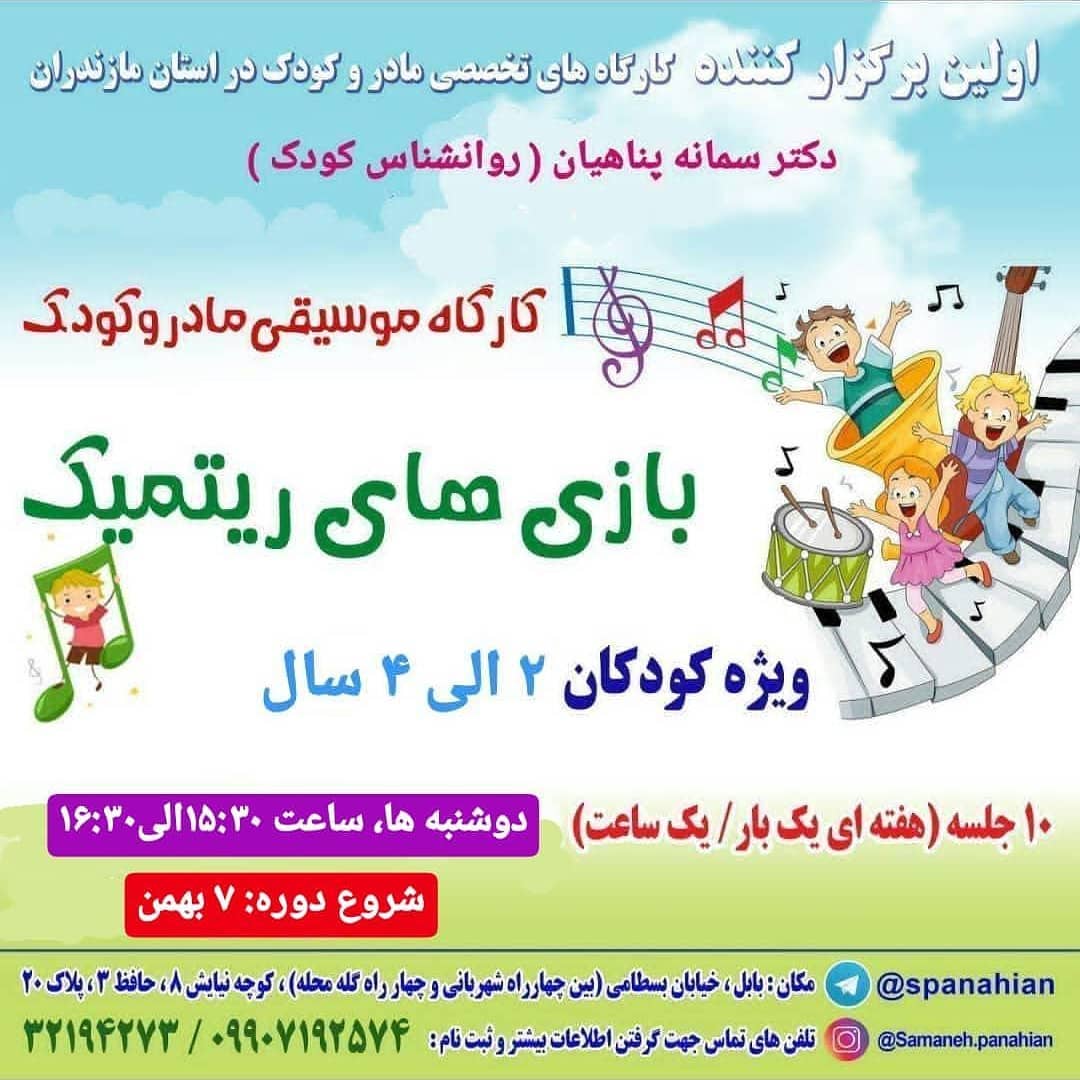 😍 کارگاه موسیقی مادر و کودک ( بازی های ریتمیک )💠 🎉 گروه سنی ۲ الی ۵ سال ✨مازندران، بابل، خیابان بسطامی، کوچه نیایش۸، حافظ۳، پلاک ۲۰، دفتر مشاوره تخصصی کودک( خانم دکتر پناهیان برای گرفتن اطلاعات بیشتر و ثبت نام تماس بگیرید تا راهنمایی های لازم را دریافت کنید ☎️09907192574 32194273 @samaneh.panahian #سمانه_پناهیان #روانشناس_کودک #اولین_برگزارکننده_کارگاههای_تخصصی_مادروکودک_دراستان_مازندران #دارنده_مجوز_رسمی_از_سازمان_نظام_روانشناسی_و_مشاوره_کشور