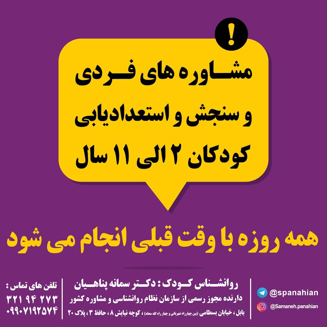 مشاوره فردی و سنجش و استعدادیابی کودکان، همه روزه با وقت قبلی انجام می شود ☎️09907192574 32194273 @samaneh.panahian #سمانه_پناهیان #روانشناس_کودک #دارنده_مجوز_رسمی_از_سازمان_نظام_روانشناسی_و_مشاوره_کشور #مازندران_بابل