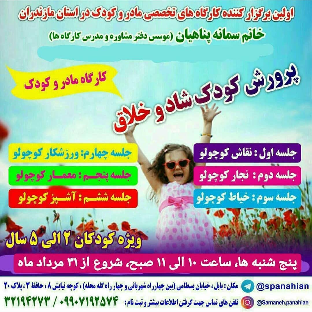 دکتر سمانه پناهیان/ روانشناس کودک و نوجوان اولین برگزار کننده کارگاه های مادر و کودک در استان مازندران آغاز فعالیت از سال 88 مازندران، بابل، کمربندی شرقی، گلستان 15، مجموعه تخصصی روانشناسی کودک و نوجوان