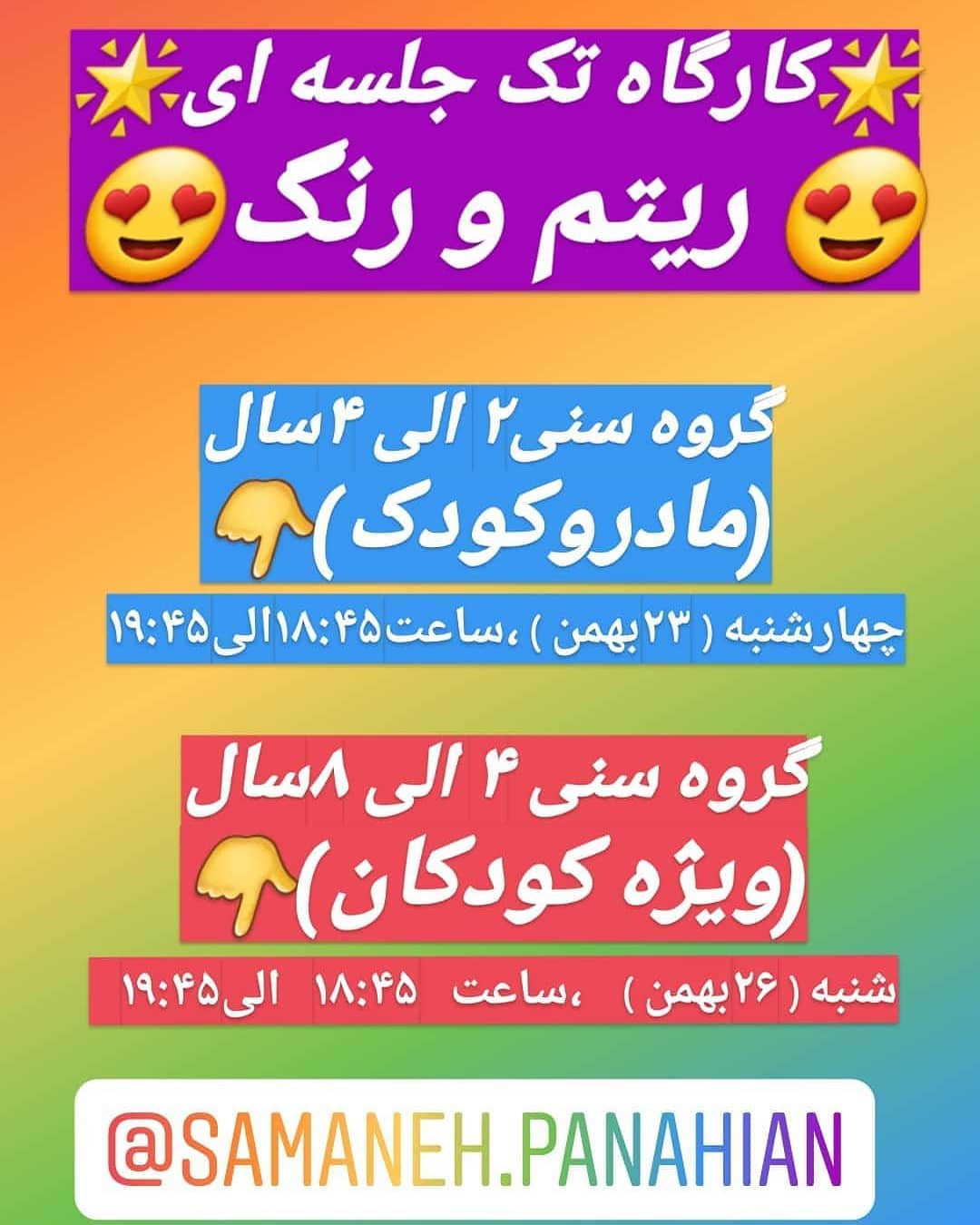 🥰کارگاه تک جلسه ای ریتم و رنگ🥰 💕چهارشنبه(۲۳ بهمن)،ساعت ۱۸:۴۵الی۱۹:۴۵ گروه سنی ۲ الی ۴ سال ( مادر و کودک )💕 💕شنبه(۲۶بهمن)، ساعت۱۸:۴۵ الی۱۹:۴۵ گروه سنی ۴ الی ۸ سال( ویژه کودکان )💕 هزینه: ۳۰ هزارتومان ☎️09907192574 32194273 @samaneh.panahian #ریتم_رنگ🎨🎨🎨🎨 #ریتم #رنگبازی🌈🎨 #رنگ_بازی #مادروکودک #کارگاه_مادروکودک #دکتر_سمانه_پناهیان #روانشناس_کودک #اولین_برگزارکننده_کارگاههای_تخصصی_مادروکودک_در_استان_مازندران #دارنده_مجوز_رسمی_از_سازمان_نظام_روانشناسی_و_مشاوره_کشور
