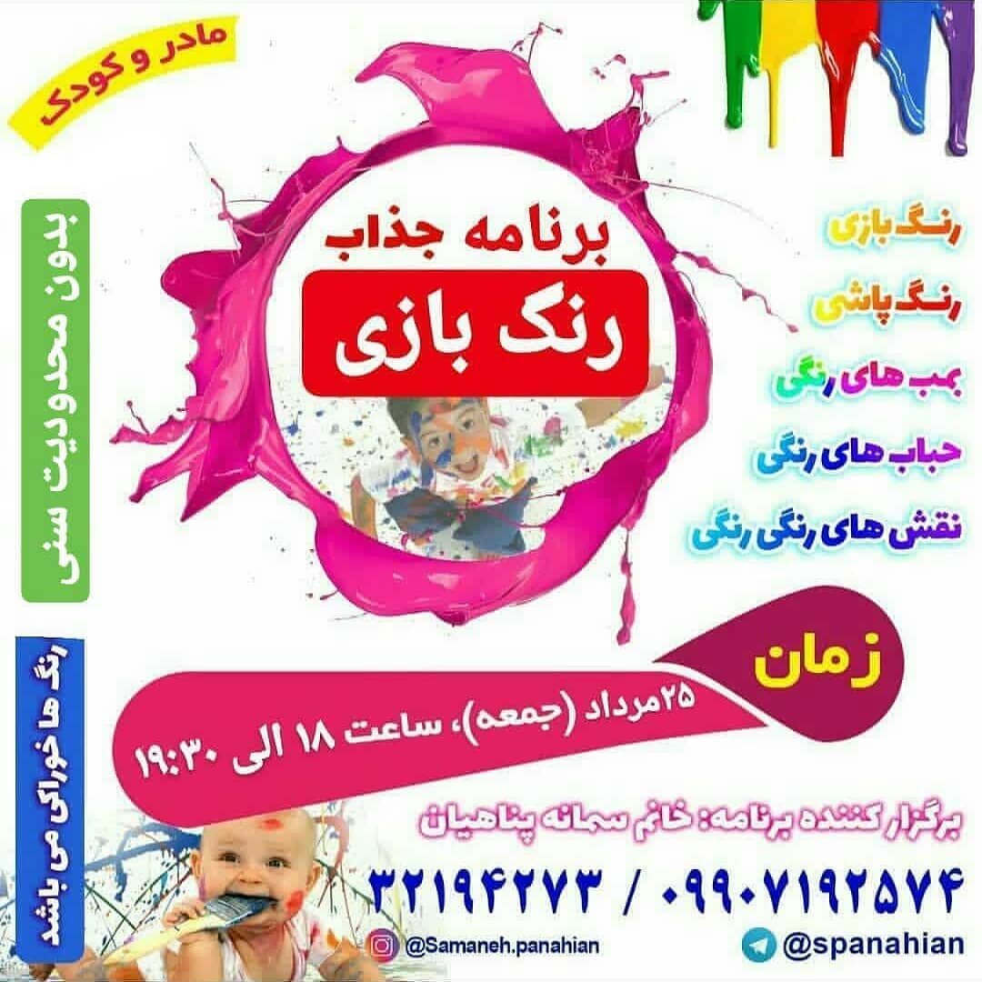 برنامه جذاب رنگ بازی در فضای سبز🎆🎉 ۲۵ مرداد(جمعه)، ساعت ۱۸ الی ۱۹:۳۰✨ 💠بدون محدودیت سنی💠 😍مادران عزیزی که کودک زیر ۲ سال دارید، با خیال راحت میتونید تو این برنامه جذاب شرکت کنید چون رنگ ها خوراکی می باشد😍 هزینه مادر و کودک : ۳۸ هزار هر همراه : ۲۰ هزار به محض تکمیل ظرفیت از پذیرش افراد معذوریم🙏 😉لطفا فقط مادرانی که کودک درون فعال دارند در این برنامه رنگی رنگی شرکت کنند و حتما یک دست لباس اضافه یادتون نره😉 @samaneh.panahian #رنگ_بازی #حباب_رنگی #دود_رنگی #رنگ_پاشی_با_تفنگ #رنگ_پاشی_با_بادکنک #همه_چیز_رنگی_رنگی😍