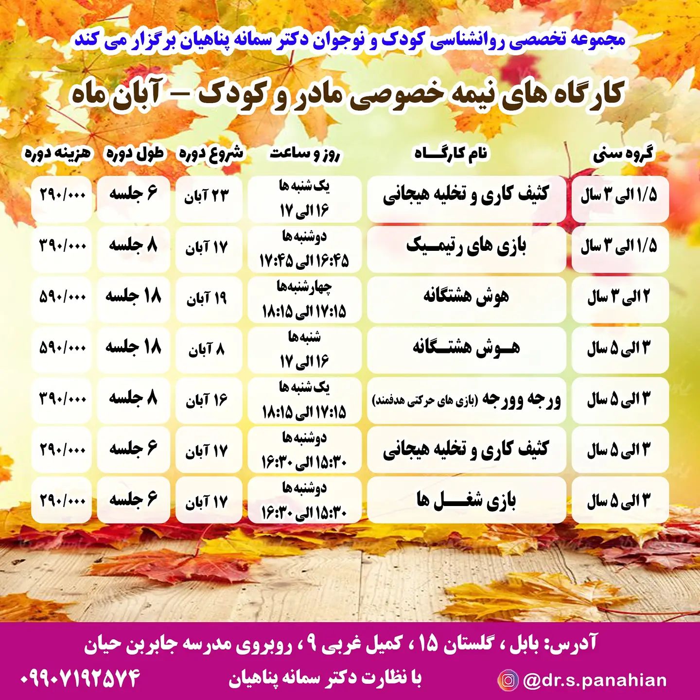🌟 کارگاه های آبان ماه 🌟 برای گرفتن راهنمایی و اطلاعات بیشتر و ثبت نام دایرکت درخدمتیم💚 @dr.s.panahian مازندران، بابل، کمربندی شرقی، گلستان۱۵، کمیل غربی۹، روبروی مدرسه جابربن حیان، مجموعه تخصصی روانشناسی کودک و نوجوان دکتر سمانه پناهیان 09907192574 #مادروکودک #ویژه_کودکان #ویژه_نوجوانان #مشاوره_کودکان #مشاوره_نوجوان #سنجش_و_ارزیابی #استعدادیابی