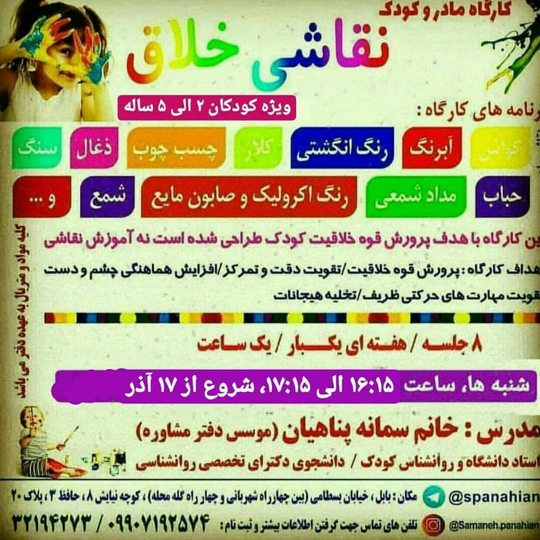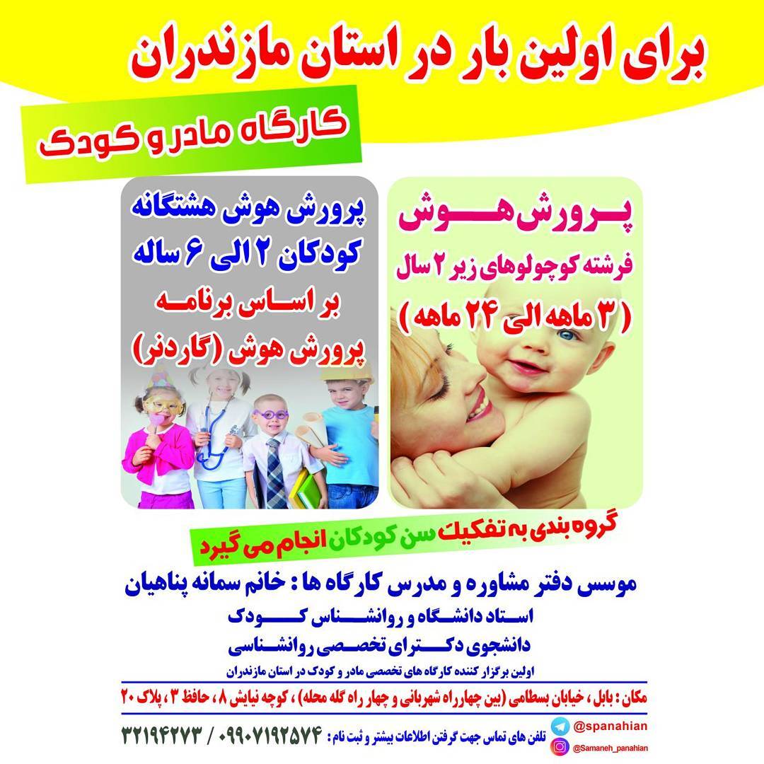دکتر سمانه پناهیان/ روانشناس کودک و نوجوان اولین برگزار کننده کارگاه های مادر و کودک در استان مازندران آغاز فعالیت از سال 88 مازندران، بابل، کمربندی شرقی، گلستان 15، مجموعه تخصصی روانشناسی کودک و نوجوان