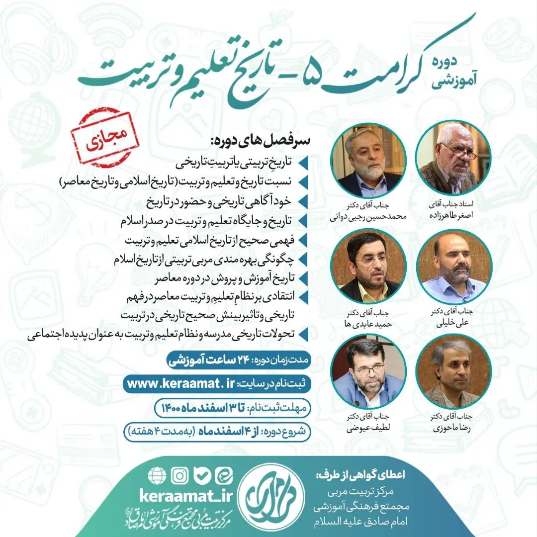 💡 *دوره آموزش مجازی کرامت۵؛ تاریخ تعلیم و تربیت* 🔸 ۲۴ ساعت آموزشی طی ۴هفته ⛔️ مهلت ثبت نام: ۳ اسفند 📌 همراه با اعطای گواهی از طرف مرکز تربیت مربی کرامت 🔆 *ارائه کد تخفیف به شرکت کنندگان دوره های گذشته کرامت، مادران دارای سه فرزند و بیشتر، طلاب و دانشجویان* 🔆 دریافت کد تخفیف در پیام رسان بله و ایتا با نام کاربری @keraamat_majazi یا شماره 09021818022 🌐 اطلاعات بیشتر و ثبت نام در www.keraamat.ir ✅ @keraamat_ir #کرامت #آموزش #تربیت #تعلیم_تربیت