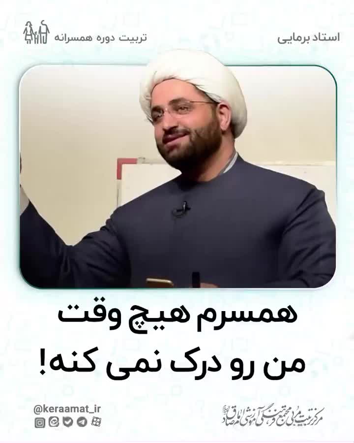 . 📍همسرم هیچ وقت منو درک نمیکنه.! آدمهایی که به لحاظ خلقی سیاه و سفید یا صفر و صدی هستند میگویند، تو «هیچ وقت» مرا درک نمیکنی و هیچ وقت نمیفهمی من چه میگویم؟! در مقابل چنین افرادی لازم است به گونهای رفتار کرد که طرف مقابل خودش متوجه شود. خداوند در سوره زمر در چند جا از بندگانش میپرسد که آیا تا به حال یک بار هم نشده که من مشکلات تو را حل کنم؟ در ما مذهبیها چنین اختلالات شناختی مانند سیاه و سفید دیدن، صفر و صد بودن یا هیچ وقت و هرگز و ای کاش استفاده کردن زیاد است. راه حل این مشکل این است که از او بپرسیم آیا یک بار هم نشده من تو را فهمیده باشم؟ یعنی کمکش کنیم که خودش به یاد آورد. امام باقر علیه السلام میفرمایند: یادآوری خوشبختیها و سعادتهای گذشته، شفقت آینده و حال خوب امروز را تضمین میکند. 🔖حجت الاسلام برمایی. 📚کرامت یک 📌ما در کرامت، برایتان از اندیشه های مختلف تربیتی می گوییم، چراکه نگاه نقادانه ی شما ارزشمند است. #برمایی #استاد_برمایی #سیاه #سفید #صفر #همسر #اختلال_شناختی #درک_کردن #حال_خوب #سعادت #خدا #مشکل #بنده