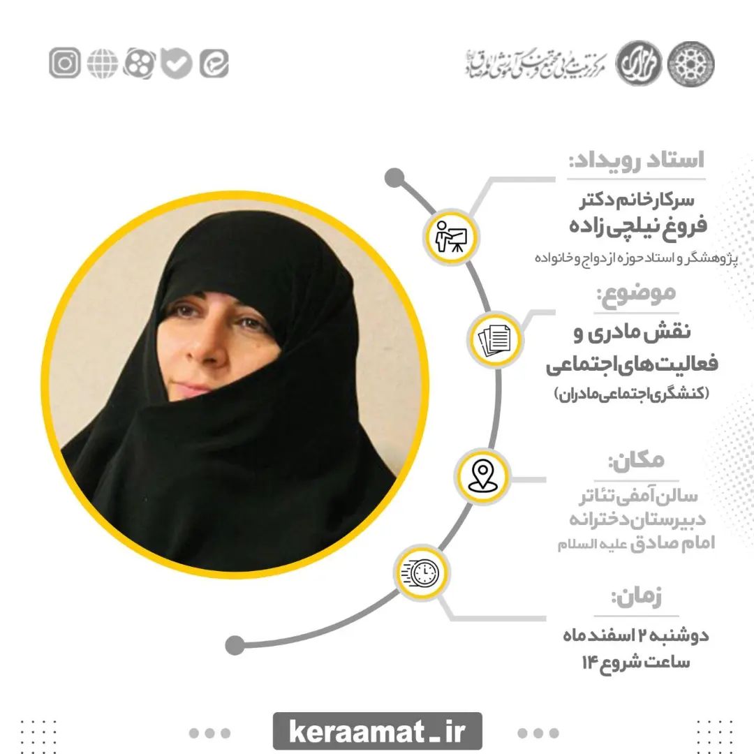 💡 *رویداد آموزشی حضوری نقش مادری و فعالیتهای اجتماعی* 🕰 زمان برگزاری: دوشنبه ۲ اسفند ساعت ۱۴ 📌مکان: تهران، شهرک غرب، هرمزان، آمفی تئاتر دبیرستان دخترانه امام صادق (ع) 🔴 *این رویداد به صورت حضوری برگزار میشود و با توجه به رعایت شیوه نامه های بهداشتی، ظرفیت ثبت نام محدود است* 🌐 اطلاعات بیشتر و ثبت نام در www.keraamat.ir ✅ @keraamat_ir #کرامت #مادر #تربیت #مادری #آموزش # نیلچی_زاده