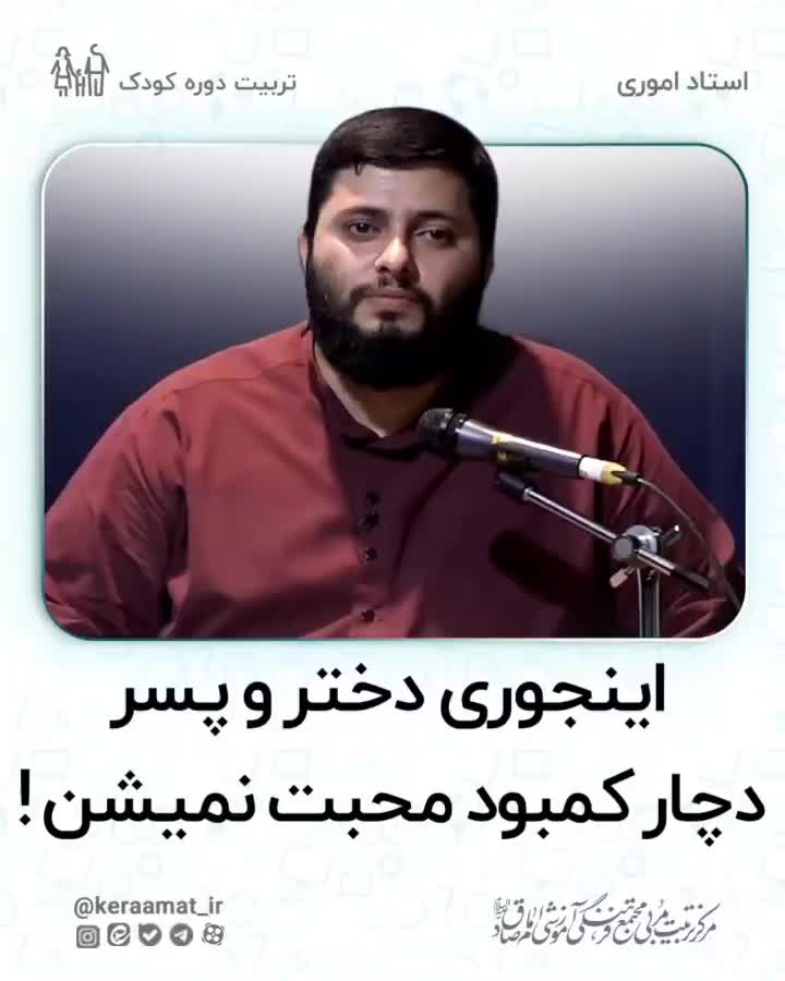 . 📍اینجوری دختر و پسر دچار کمبود محبت نمیشن! . اصلیترین چیزی که در احساسات یک مرد وجود دارد که هویت او را میسازد، اقتدار است. اما اقتدار با دیکتاتوری متفاوت است. مقتدرها معمولا مهرباناند، زیاد امر و نهی نمیکنند و اهل تغافل هستند. اینها لوازم اقتدار مرد است که خود ایجاد میکند، اما بخش مهمتر این است که زن، اقتدار شوهرش را حفظ کند و بگوید هر چه شوهرم بگوید. حتی اگر چیزی که مرد میگوید، همان چیزی باشد که خانم در خلوت به او گفته است. در مقابل، هویت زن به محبوب بودن او درون خانواده است. اگر زنی محبوب نباشد از درون میشکند. این را مرد خانواده باید رعایت کند و در همه چیز و حتی نوع صدا کردن و حرف زدنش هم مشخص باشد. به طوری که احساس بچهها این باشد که بابای ما، مادرمان را خیلی دوست دارد. اثر این رابطه دو طرفه بر فرزندان نمایان میشود. به طوری که اقتدار پدر، بیش از هر کسی بر دختر و محبوبیت مادر، بیش از هر کسی بر پسر موثر است. پسری که کمبود محبت ندارد نشان میدهد که مادری محبوب داشته است و دختری که کمبود محبت ندارد، نشان دهنده این است که پدری مقتدر داشته است. . . . آقای مقداد اموری. پیوند مقدماتی. . 🔻ما در کرامت، برایتان از اندیشه های مختلف تربیتی می گوییم، چراکه نگاه نقادانه ی شما ارزشمند است.🔻 . . . . . #اموری #کرامت #اقتدار #والدین #جنسی #جنسیت #خانواده #مشاوره #انتخاب #تربیت