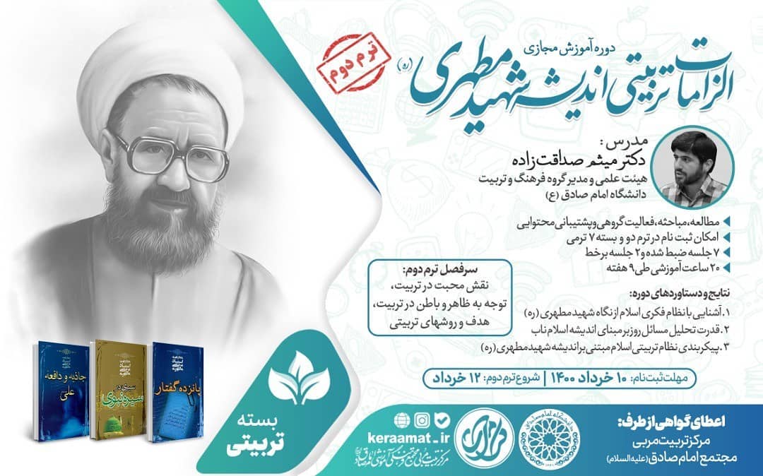 ⭕معرفی بسته ویژه "الزامات تربیتی اندیشه شهید مطهری" برای تهیه بسته به سایت کرامت مراجعه کنید ✅ در این دوره ۲۰ جلد از آثار شهید مطهری تشریح و تبیین میشود. از جمله دستاوردهای این دوره آشنایی با نظام فکری اسلام از نگاه شهید مطهری و قدرت تحلیل مسائل تربیتی بر مبنای اندیشه اسلام ناب است. 🔸این بسته در ۹۹ ساعت آموزشی ارائه میشود. 📌برای این بسته ان شاءالله در هفته اول مرداد ۱۴۰۱ آزمون برگزار میشود و گواهی معتبر از سوی مرکز تربیت مربی کرامت صادر خواهد شد. 📞در صورت وجود هر گونه سوال در مورد این بسته میتوانید به نام کاربری keraamat_ir@ يا شماره ۰۹۳۶۵۷۹۵۵۹۸ ، در بله، ایتا یا واتس آپ پیام دهید. #کرامت #تربیت #آموزش #فرزند #الزامات #شهید_مطهری #تربیت_دینی #استاد_مطهری #صداقت_زاده