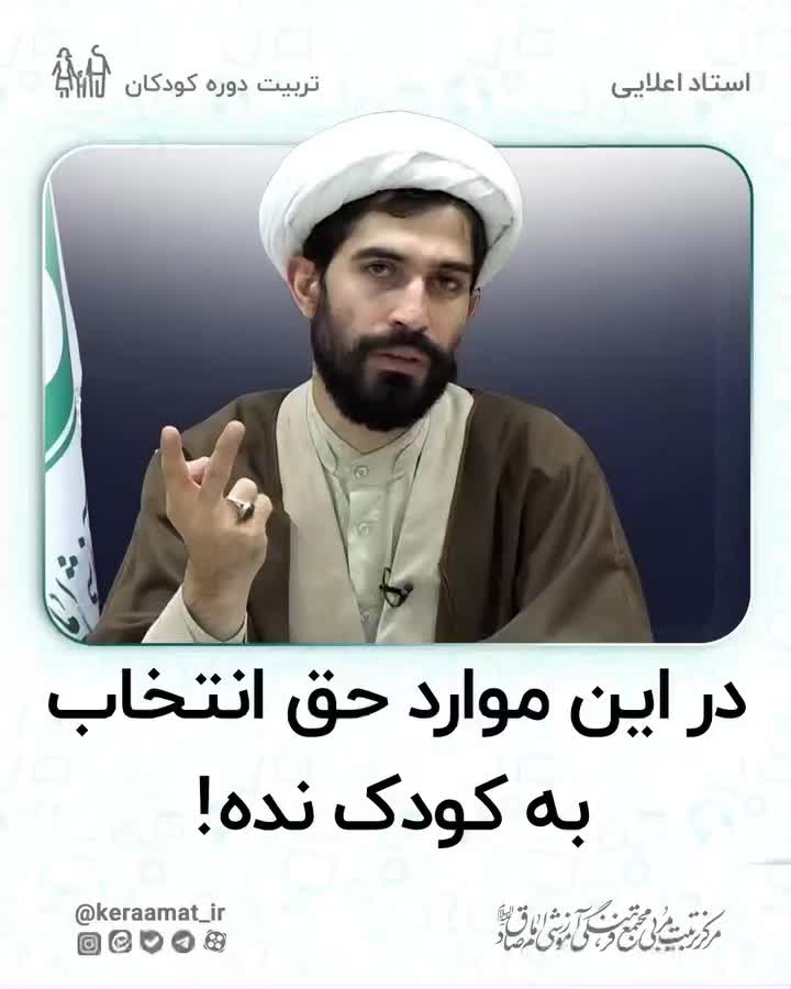 . 📍در این موارد حق انتخاب به کودک نده! در فکر کردنها و تصمیمگیریها لازم است بچهها را مشارکت دهیم. این درست نیست که فرزند یک خانواده ۲۰ ساله شده و هنوز برای رفتن به سفر آدم حساب نمیشود که با او همفکری کنیم! حتی یک کودک دبستانی را هم لازم است در جریان بیرون رفتنها قرار داد. اگرچه ممکن است در انتخاب محل سفر خیلی دخیل نباشد، اما در مورد برخی برنامههای سفر میتواند نظر دهد. مثلاً اگر ما تشخیص دادیم که به مشهد برویم، میتوانیم تصمیم گیری برای اینکه کدام اسباب بازیهایش را همراه خود بیاورد یا یک برنامه تفریحی در سفر را به او بسپاریم و کم کم که بچهها بزرگتر میشوند، میتوانند در مورد انتخاب مکان سفر هم جدیتر وارد شوند. اما اگر بچهها را در سنین مختلف آدم حساب نکنیم، بزرگتر که میشوند، آنها هم ما را آدم حساب نمیکنند و دیگر با ما جایی نمیآیند. البته لازم است حواسمان جمع باشد که به جا، به بچهها حق انتخاب دهیم. یعنی بعضی جاها نباید زیاد حق انتخاب داد. مثلاً معنی ندارد یک بچه زیر دبستان در مورد لباس و اسباب بازیهایش نظر دهد. چون صلاحیت انتخاب ندارد. در این سن باید لباسهای مناسب را برایش انتخاب کنیم و او از بین آنها، انتخاب کند. باید حواسمان باشد که انتخابها در دایره سن فرزندمان باشد. 🔖حجت الاسلام اعلایی. 📌ما در کرامت، برایتان از اندیشه های مختلف تربیتی می گوییم، چراکه نگاه نقادانه ی شما ارزشمند است. #اعلایی #استاد_اعلایی #انتخاب #فامیل #مسافرت #مشهد #همفکری #تفریح #اسباب_بازی #خانواده