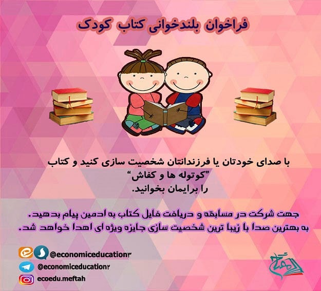 📢📢توجه توجه شما هم به "فراخوان بلند خوانی کتاب" دعوتید😍😍😍 . جهت دریافت فایل کتاب به ادمین مفتاح در کانال های ذکر شده پیام بدهید😊 . 🌺از هم اکنون منتظر شنیدن صدای گرمتان هستیم🌺 . ◀️مفتاح؛موسسه فرهنگی هنری تربیت اقتصاد حکیم. . ما در سروش،ایتا و تلگرام دنبال کنید✌😊 منتظرتان هستیم🙏 #تربیت#اقتصاد#کودک#مسابقه#کتاب#کتابخوانی#صدا#صوت#صوتی#مسابقه_صدا#مسابقه_صوتی#کفش#کفاش#کودکی#والدین#فرزند#تربیت_اقتصادی#مفتاح