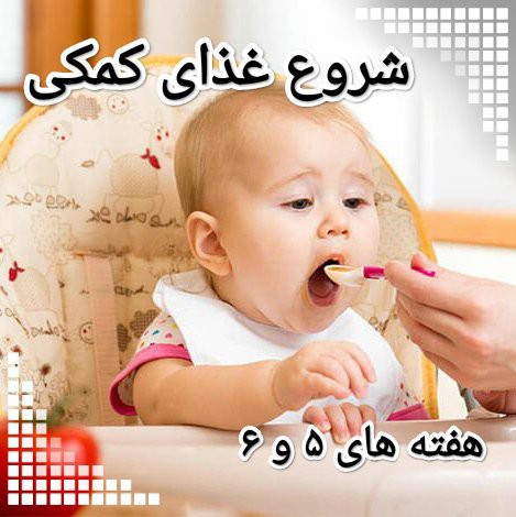 ۴_۶ ماهگی: غلات: غلات غیرگندمی، برنج، جوی دوسر، ارزن، جو، چاودار، سویا(این مواد را با دو برابر حجم آب بپزید) انواع نوشیدنیها: آب میوه و سبزیجات کاملا رقیق سبزیجات: انواع هویج، نخود، لوبیا، باقلا، انواع کدو، شلغم، کرفس، کلم، اسفناج میوهها: میوه های پخته شده مانند سیب، گلابی، موز رسیده محصولات لبنی: هنوز زود است. گوشت: هنوز زود است. حبوبات: هنوز زود است. ماهی: هنوز زود است. تخم مرغ: هنوز زود است. دانه ها، مغزها: هنوز زود است. این غذاهارا محدود کنید: انواع نوشیدنیهای شیرین از جمله شربتهای نوشیدنی مثل آب انگور سیاه «غذاها به صورت #پوره شده و مخلوط شده باشد.» منبع: اولین غذاها #غذای_کمکی