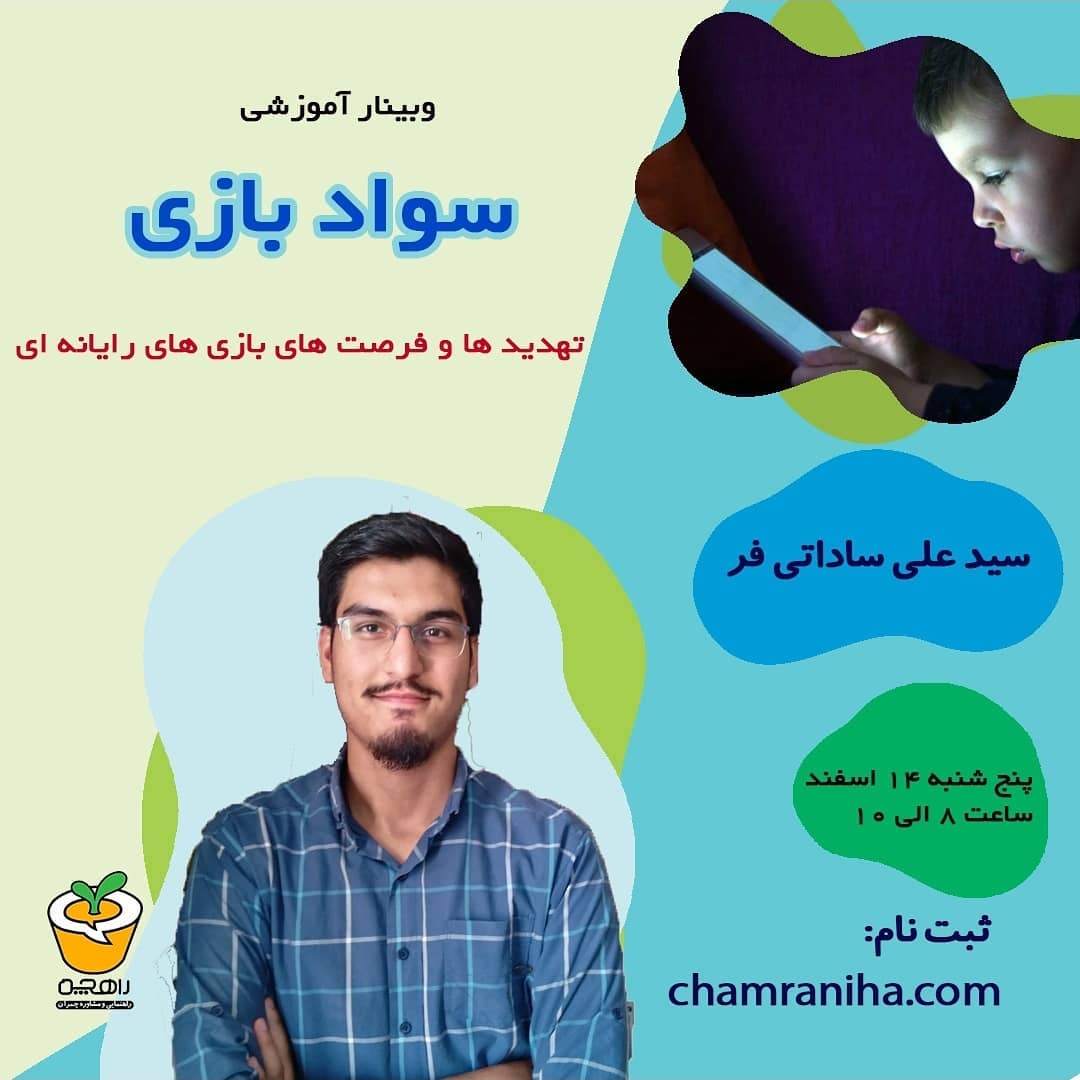 . _چه قدر بازی میکنی چشمات ضعیف میشه!!!🧐 _بسه مادر من! یذره به درس و مشقت برس!🤓 _دوباره برا خودت بازی دانلود کردی؟!!!☹ _من نمیدونم این بازی چی داره شما بچه ها همش سرتون تو گوشیه!😒 . شما هم این جملات ر و زیاد شنیدید و یا استفاده میکنید؟! پس وبینار" سواد بازی"مخصوص شماست❗❗❗ . 👤مدرس: سید علی ساداتی فر ⏰زمان: پنجشنبه ۱۴ اسفند ⏱ساعت: ۸ الی۱۰ صبح ✔قیمت: ۳۷۰۰۰ تومان❌ ⭕اما اگر هرچه زودتر ثبت نام کنید ۲۰٪ تخفیف داره(۲۹۶۰۰ تومان) . مخاطب: مادرها و پدرهای دغدغه مند و معلمین خلاق . ✅سرفصل های وبینار👇🏻 🔸️مقدمه: ١. بررسى حوزه عام سرگرمى (بطور خاص سرگرم آموزى) ٢. مفهوم گیم (game) در مقابل مفهوم پلى (play) ۳.بازی،عنصر متفاوت دنیای رسانه 🔸️طرح دغدغه: ۴. ظرفیت این حوزه در تعلیم و تربیت ۵. نقش این حوزه در ایجاد سبک زندگى کودک و نوجوان 🔸️طرح مسئله: ۶. گیم (Game) عنصر مهم در تاثیر پذیرى نسل جدید ۷. در آینده بستر اصلى حوزه تعلیم و تربیت چیست؟ 🔸️ارائه راهکار: ۸. جهت دهى به نحوه ى مواجهه والدین با این مسئله! ۹. رده بندى بازى هاى رایانه اى در ایران ۱۰. ابزار هاى کنترلى (کنترل نامحسوس) ۱۱. استفاده بهینه از فرآیند بازى ۱۲. تاثیر بازى ها بر ابعاد مختلف؛ مهارتى، دانشى،شناختی و شخصیتى 🔸️معرفى منابع . ⭕برای ثبت نام در وبینار همین حالا به سایت چمرانی ها سربزنید و یا دایرکت بدید👇🏻🤗 . Chamraniha.com . #سواد_بازی#بازی#بازی_رایانه_ای #بازی_کامپیوتری# والدین_آگاه #معلم_خلاق #سرگرمی_کودکان#رسانه#تربیت_فرزند#وبینار_آموزشی