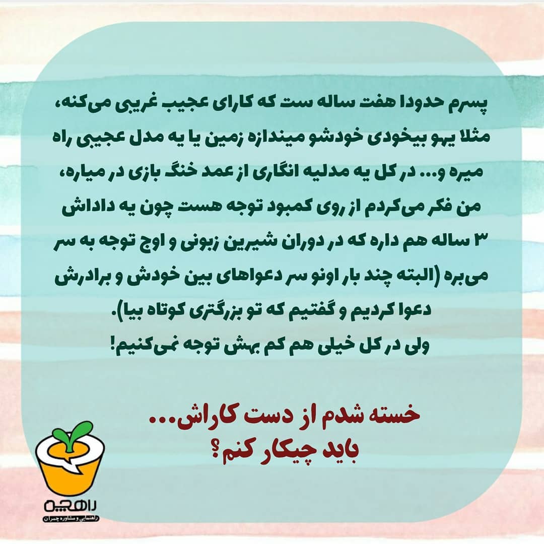 به نظرتون با رفتارهای عجیب این پسربچه چیکار باید کرد؟؟ دلیل رفتارهاش چی میتونه باشه؟ ممکنه به خاطر کمبود توجه باشه؟🤔 این یکی از مسائلی هست که شما برامون فرستادید. . نظراتتون رو برامون کامنت کنید👇 . #پرسش_و_پاسخ #سوال_تربیتی_کودک #راهچه#همراهی_کودک#والدین_آگاه #والدگری #تربیتی_کودک