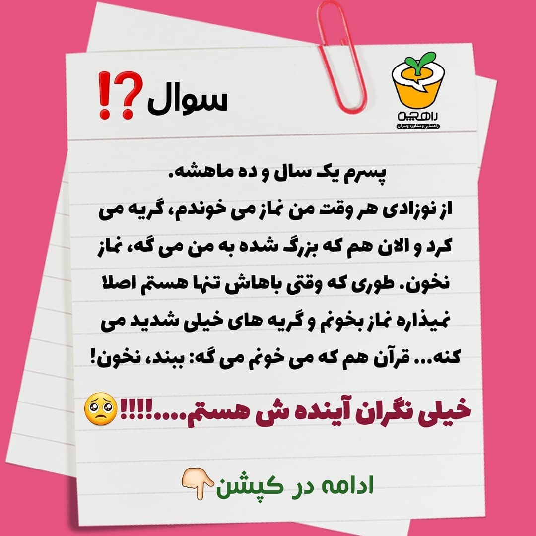 هرکاری میکنم اینجوریه...👇🏻😢 اخیرا حتی به پدرش، مادربزرگ و خاله اش هم این ها رو می گه.😓 با اینکه حتی موقع نماز هم گاهی نگاهش می کنم، لبخند میزنم، اگر کنارم بیاد، دستی به سرش می کشم... همه خانواده هم نمازخوان هستند. نگران این وضعیت تو آینده پسرم هستم.... . ❗❗❗❗و اما پاسخ مشاور: . ◾توصیف مساله: . اولا تاکید می کنم که مسئله را کودکانه ببینید و ابعاد دینی را با این مسئله خلط نکنید. یعنی بچه ی شما دوست دارد تمام توجه شما را به خودش اختصاص بدهد. این مواقع این توجه از او سلب می شود. . 🔹️ریشه: این گونه رفتارها عموما نشان از مشکلی در رابطه ی عاطفی فرزند و مادر دارد. متوجه شده که شما در این موارد حساس هستید. با این رفتارها خودنمایی می کند. حساسیت های شما به احتمال زیاد، بیش از حد معمول است. چیزی که خیلی به ترمیم روابط عاطفی کمک می کند، بازی های هیجانی و حرکتیست. . ✅راهکار: 1. باید نسبت به موقعیت نماز احساس خوبی داشته باشد. او را به مسجد ببرید حتی به قیمت اینکه شما یا پدر، نماز نخوانید و با او بازی کنید. یا یک نماز را بخوانید. این احساس خوب را نسبت به فضای نماز برای او ایجاد کنید. برایش خوراکی بخرید. اسباب بازی کوچکی یا خوراکی از داخل جانمازتان بیرون آورید و به او هدیه دهید. البته این ها نباید به گونه ای باشد که او را شرطی کند. . 2. سعی کنید قبل و بعد از نماز، با چادر نماز خود با او بازی کنید. بچه ها در این سن از لمس پارچه خصوصا پارچه های رنگی لذت می برند. . 3. لزومی ندارد که حتما بعد از نماز تعقیبات بگویید. بلافاصله بعد از نماز او را در آغوش بگیرید. تا این حس منفی از او دور شود. . ⭕این پست رو سیو کنید و برای اون عزیزایی که نگران آینده بچه هاشون هستن، بفرستید🤗 . #پرسش_و_پاسخ #مسئله_دینی#والدین_آگاه #نمازخوان_شدن_فرزندانمان #آینده#والدگری #تربیت_دینی #تربیت_فرزند #سوال_تربیتی