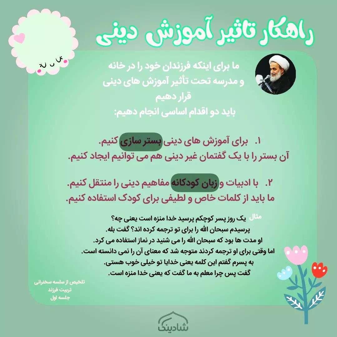 راهکار تاثیر آموزش دینی میدونی الان آموزش مسائل دینی زیاده شده اما شاید تاثیر لازم رو نداشته باشه همونجوری که نسل قبل کودکان که الان جوان شدند رو میبینیم که هنوز سبک زندگی هاشون تا اسلامی شدن فاصله داره... حجت الاسلام پناهیان سلسله سخنرانی در مورد تربیت دینی فرزند دارن که الحق و انصاف بسیار مهم و کاربردی است .و در مورد هرکدام از مطالبشون میشه ساعت ها روانشناس ها و فعالین تربیتی صحبت کنند انشاءالله بتونیم هر هفته ازشون یه خلاصه از هر جلسه بذاریم . #تربیت_دینی #تربیت_کودک #پناهیان #بستر_سازی #زبان_کودکان #اسلام_برای_کودکان #شادینک #محرم
