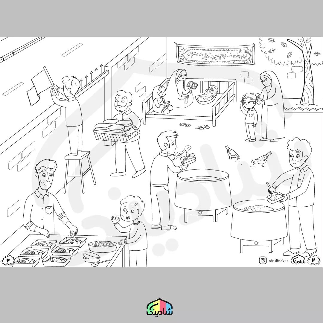 بسته ی #رنگ_آمیزی_متری ، ۵ قطعه ی کاغذی ۵۰در ۷۰ سانتی متر است . تصویرهای نقاشی شده روی این رول ، با موضوع #آداب اسلامی در اعیاد مذهبی است مثل #اطعام و عیدی دادن و دعاهای مخصوص و ... . میتوانید با نشان دادن هر تصویر این اعمال را به زبان #کودکانه توضیح دهید . این رنگ آمیزی منحصر به عید خاصی نیست و میتوان برای تمامی مراسم های شاد مذهبی مانند عید بزرگ غدیر ، عید فطر ، روز نیمه شعبان ، ولادت پیامبر اکرم(ص) و .. استفاده کرد . فریم دوم نمای حیاط خانه است که در حال درست کردن نذری و هم چنین خواندن دعا بر سر دیگ نذری هستند . تک تک جزئیات برای ما مهم بوده ... #غدیر #عید_غدیر