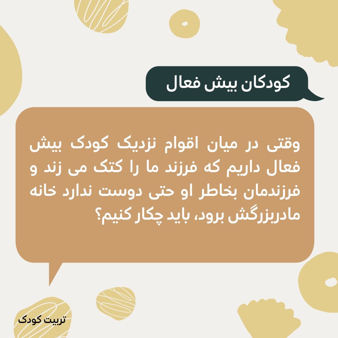 روانشناس نمی تواند قبل از سن ۴ سالگی تشخیص #بیش_فعالی بدهد. بعدها هم اگر چنین تشخیصی بدهند، بیش فعالی به مرور زمان تا حد زیادی بهتر می شود و بخش کمی از آن ممکن است باقی بماند که اسم #اختلال به خود می گیرد. در سنین ۴-۳ سالگی هر قدر پدر و مادر بیشتر کودک را #تکریم کنند، در #آغوش بگیرند، ببوسند و به او #محبت کنند، احتمال اینکه رفتارهای کودک اصلاح بشود بیشتر می شود. به این منظور، محبت کردن به این کودکان پرتحرک، باید مکرر و زیاد در طول روز انجام شود که تفاوت واضحی با وضعیت عادی داشته باشد. در مورد کارهای خطرناک کودک گاهی لازم است #تنبیه کوچکی صورت بگیرد، مانند #محروم شدن از چیزی، به اتاق رفتن و فکر کردن، #ترشرویی والدین و...، این کارها در کنار محبت شدید و زیاد می تواند کمک کننده باشد. #تربیت_کودک #پرسش_و_پاسخ
