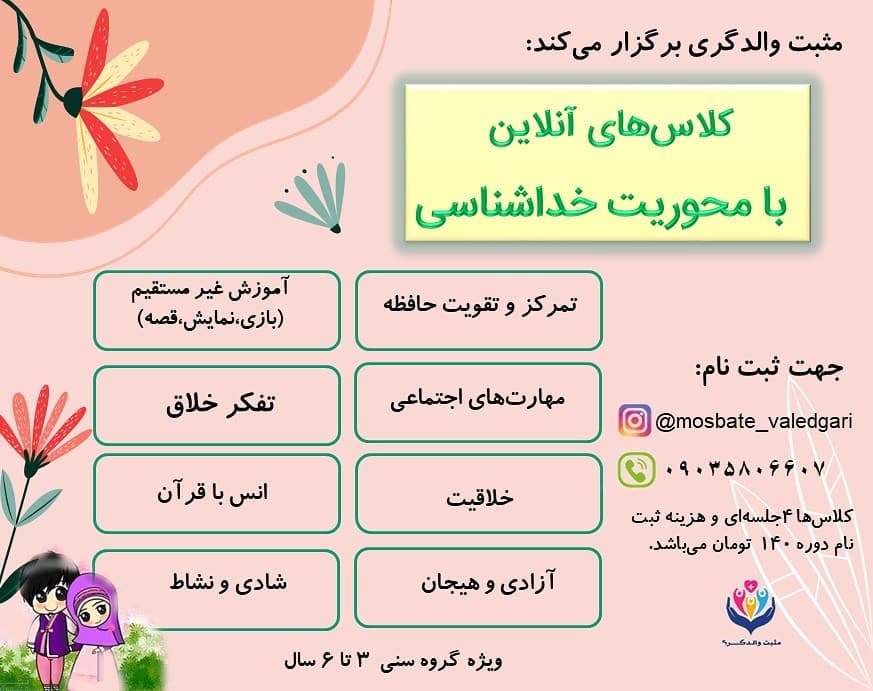#کلاس_آنلاین با محوریت خداشناسی☉ ✔هدف مثبت والدگری ایجاد شور و نشاط و خاطرههای شیرین و زیبا از مفاهیم مذهبی و ارزشی در ناخوداگاه کودکان است. 🔴در این کلاس ها هدف اصلی آموزش غیرمستقیم و اصولی مفاهیم اسلامی با محوریت خداشناسی است و سعی شده است که به تمامی مفاهیمی که برای رشد کودکان در ۶ سال اول که دوره طلایی زندگی محسوب میشود ، توجه شود .؛ از شناخت احساسات و رنگ ها و اشکال گرفته تا کنترل هیجانات و فعالیت های لازم حرکتی و تقویت مهارت های اجتماعی برای این رده سنی با آموزش غیر مستقیم و در غالب فعالیت های جذاب 🔵با توجه به شرایط یه وجود آمده و دور بودن کودکان از فضاهای اجتماعی ما تمام تلاشمان را میکنیم تا کودکان در این کلاس ها کودکی کنند و بیاموزند. 👈این کلاسها با مربیگری مربیان حرفه ای و با تجربه ی حداقل ۶ سال در حوزه کار با کودک برگزار می شود.👌 #مثبت_والدگری #کلاس_آنلاین #مذهبی #تعلیم_و_تربیت_اسلامی #آموزش #مجازی #آنلاین #مربی_خصوصی #مربی_آنلاین #تخصصی