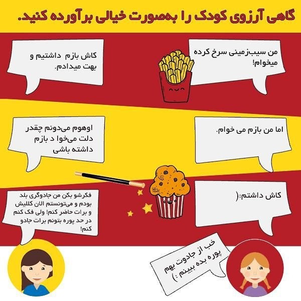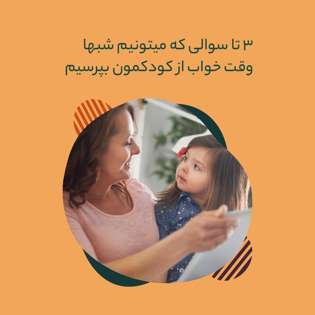 ١. يک چيز را بگو كه امروز باعث شد بخندي یا #لبخند بزني ٢. يک چيز را بگو كه باعث شد امروز #گريه كني ٣. يه چيز را بگو كه امروز ياد گرفتي يا فهميدي جواب شماره يك كمک مي كند کودک #دعا كردن را ياد بگيرد و با هم #خدا را شكر مي كنيد. جواب شماره ٢ به کودک ما ياد مي دهد بدي ها و ناراحتي ها بالاخره تمام می شوند و آرامش باز بر می گردد. پس نگران نباش و اميدوار باش. جواب شماره ٣ باعث مي شود کودک تمام عمر به دنبال ياد گرفتن و فهميدن باشد و به اين كه چيزي مي داند افتخار كند. همه اين ارتباط باعث مي شود که کودک ما عادت كند با ما صحبت کند و مشكلاتی که در سنین بالاتر دارد با ما در ميان بگذارد. این رفتار موجب می شود که ما هم بيشتر كودكمان را بشناسيم و اگر در طول روز سوء تفاهمي میانمان پيش آمده و يا اشتباهي در ارتباط با کودک خود انجام داده ایم متوجه شویم و به طور كلي، با فرزندمان لحظات خوبي را قبل از خواب بگذرانيم.