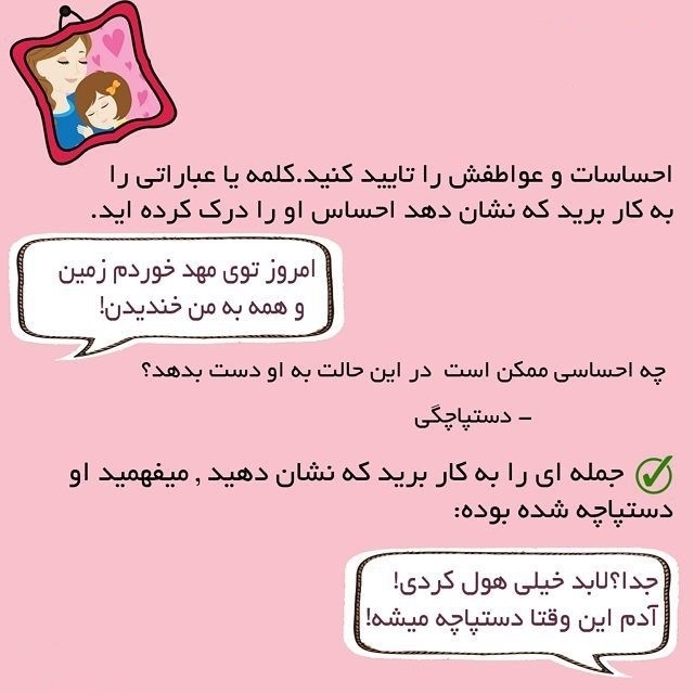. ما همیشه سعی میکنیم #احساسات خودمان را به کودکان القا کنیم! وقتی می گوید زمین خورده و همه به او خندیدند، به جای درک حسی که ممکن است به او دست داده باشد می گوییم: تو همیشه همه چیز و شلوغش می کنی این اصلا چیزی نیست که حتی بهش فکر کنی! #فرزند شما، لابد به این می اندیشد که هیچکس حال او را درک نمی کند و #سرخورده می شود.