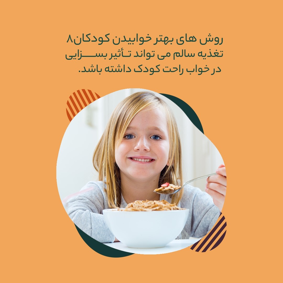 . #تغذيه سالم مي تواند تأثير بسزايي در #خواب راحت او داشته باشد. كمبود #آهن در بدن مي تواند در بدخوابي كودک مؤثر باشد. از آنجايي كه كودک در سنين #رشد قرار دارد #برنامه_غذايي فرزندتان را بايد طوري تنظيم كنيد كه #ويتامين ها و #مواد_معدني به ميزان كافي در آن موجود باشد. براي اين منظور مي توانيد از #گوشت، #سبزي، #ميوه يا حبوباتي چون #نخود و #لوبيا كه سرشار از آهن هستند استفاده كنيد. اما گوشت و #ماهي بهتر است، چون آهن موجود در آن سريع تر و آسان تر جذب بدن مي شود.