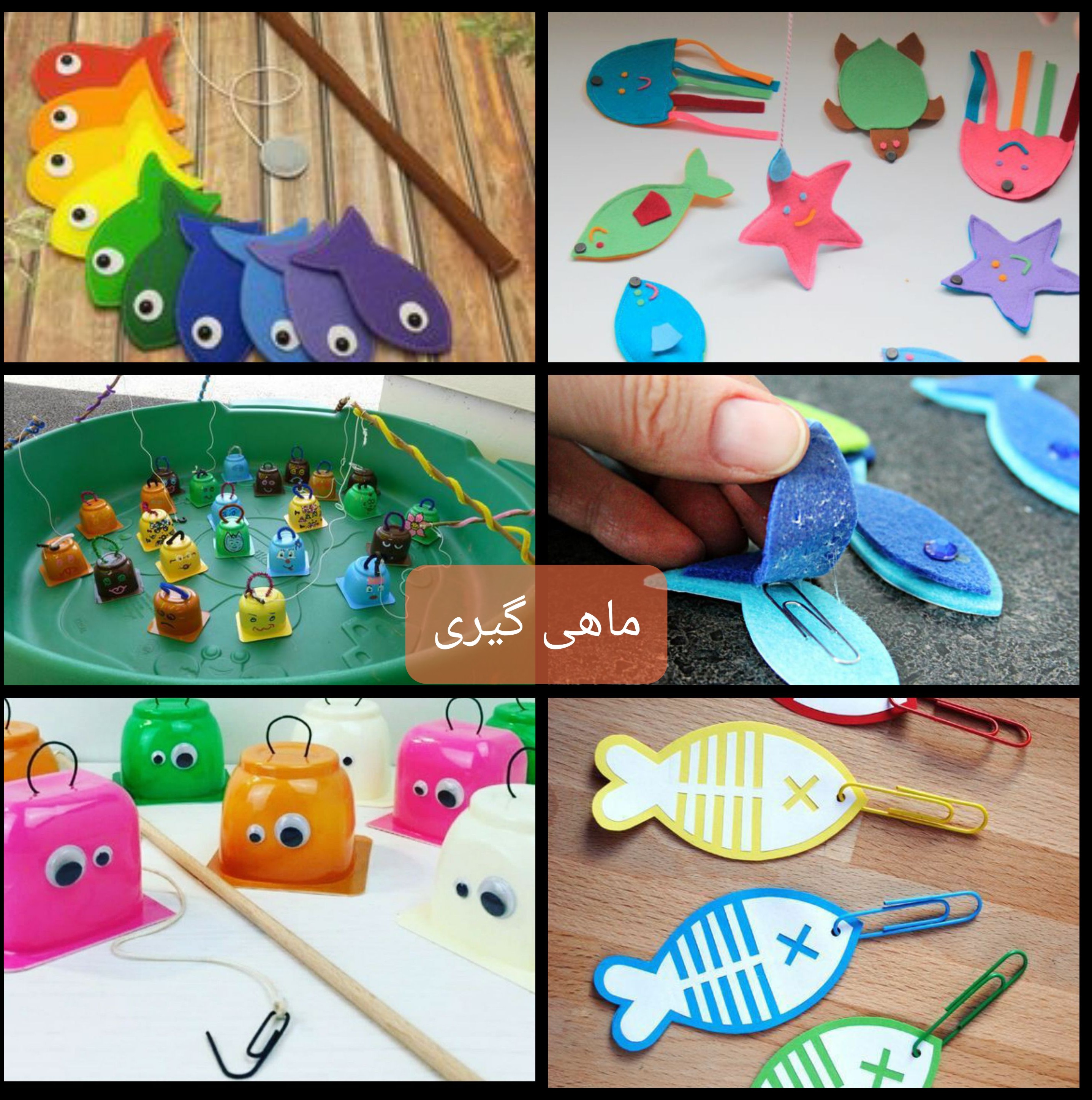 ماهیگیری #تقویت_تمرکز #شناخت_رنگها #هماهنگی_چشم_ودست گروه سنی: #۲ ، #۳ ، #۴ ، #۵ ، #۶ ، #۷ چند مدل میتونیم این بازی رو بسازیم. برای بچه های کوچکتر بهتره از آهنربا استفاده کنیم. اما بچه های بزرگتر ، میتونن از قلاب چنگکی استفاده کنن که سخت تره. ۱. ماهیگیری آهن ربایی: برای ساخت ماهی ها میتونیم از مقوا، طلق یا پارچه نمدی استفاده کنیم و طرح ماهی ها یا حیوانات دریایی دیگه رو دربیاریم. برای اینکه آهنربا به ماهی بچسبه، هم میشه یه آهنربای دیگه هم به ماهی چسبوند و هم از گیره فلزی کاغذ استفاده کرد. کافیه گیره رو به بدنه ماهی وصل کنیم یا بین دولایه پارچه بدنه ماهی بگذاریم. برای ساخت قلاب هم از یک سیخ کباب چوبی، یا مثلا شیرازه و هر وسیله ای که دارین میشه استفاده کرد. یک مقدار کاموا رو به سر چوب و انتهای دیگر کاموا رو هم به یک آهن ربا وصل میکنیم. ۲. ماهیگیری چنگکی: برای ساخت ماهی ها ، میتونیم از ظرف خالی دنت یا خامه و یا لیوان یکبار مصرف استفاده کنیم. در ته لیوان با یک تیکه مفتول، حلقه برای گیر قلاب درست میکنیم. و ماهی ها رو با گذاشتن چشم و باله و ... تزیین میکنیم. برای ساخت چنگک قلاب هم میتونیم از یک گیره کاغذ که یک سمتش رو کمی باز کردیم، استفاده کنیم. میشه ماهیگیری سرعتی باشه و زمان بگیریم یا مسابقه بین بچه ها باشه و یا میتونیم از کودک بخوایم هدفمند براساس رنگ یا شکل، ماهیگیری کنه. خوش بگذره😘
