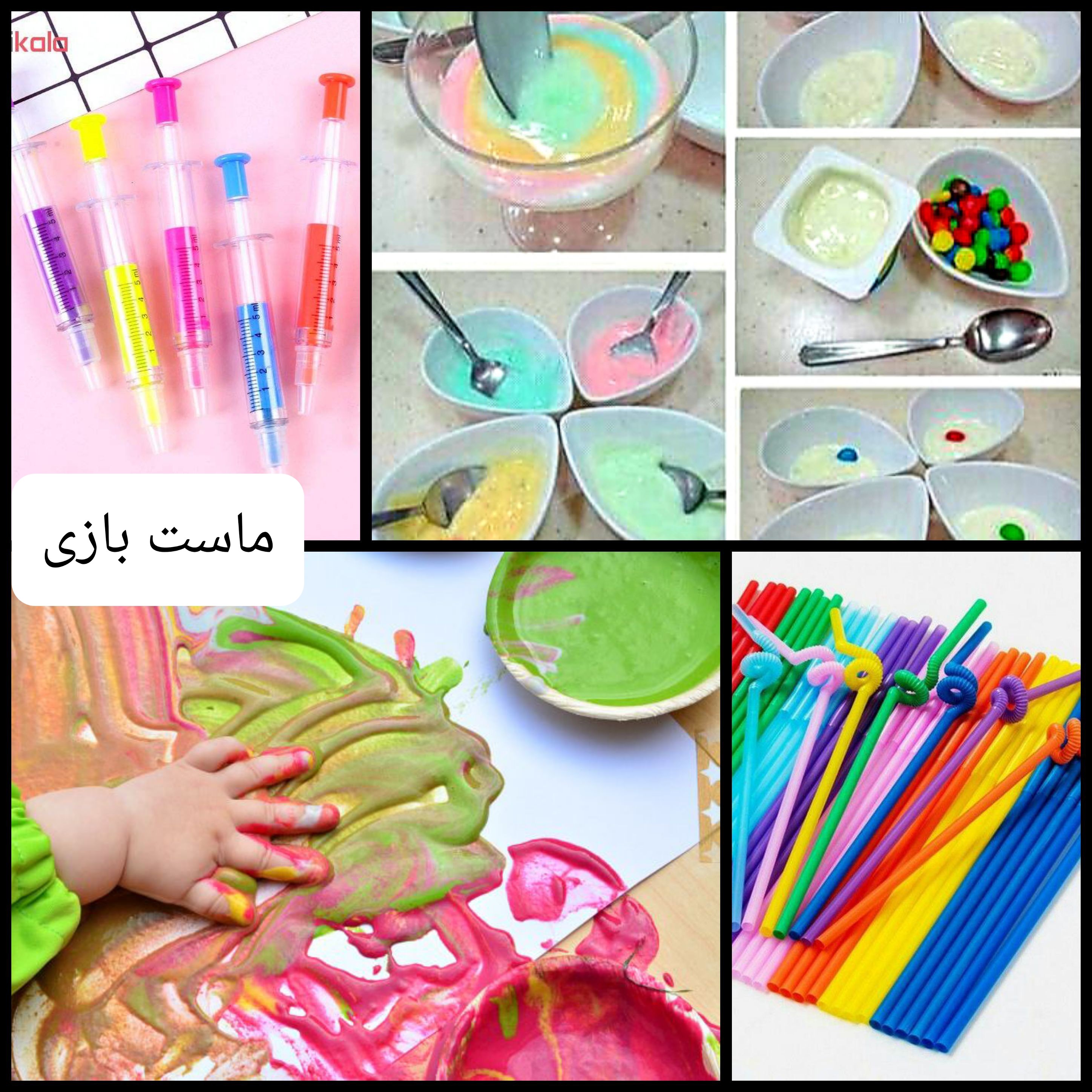 نام بازی: ماست بازی #بازی_ابزاری #بازی_حسی گروه سنی: ۱ تا ۳ سال وسایل لازم : ماست خوب همزده – کاسه- قاشق - رنگ خوراکی - اسمارتیز– سرنگ – نی - محلی برای کثیف کاری مانند حمام یا یک فضای باز مراحل بازی: (توی این بازی قاعدتا باید چندین بار توی کاسه های بچه ها ماست بریزیم یا حتی کاسه جدید در اختیارشون بذاریم. پس هر چی کاسه کوچیک تر بهتر) ۱) یک کاسه کوچیک ماست به همراه یه قاشق با بچه ها میدیم. حالا یه خورده اسمارتیز بهشون میدیم تا توی ماست بریزن هم بزنند. همین جور که هم می زنند رنگ های اسمارتیزها وارد ماست میشه و خطوط رنگی روی ماست ایجاد می کنه. ۲) حالا این مرحله رنگی کردن ماست رو با رنگ خوراکی انجام میدیم. توی کاسه پچه ها رنگ خوراکی میریزیم تا با هم زدنش طرح های ابر و باد ایجاد کنند. حالا میشه به هر کدوم یه نی هم داد تا جابجا شده ماست های رنگی در اثر فوت کردن رو ببینند. ۳) تو این مرحله میشه آموزش ترکیب رنگ ها رو هم با ماست انجام بدیم. یعنی مثلا میشه تو سه تا کاسه سه رنگ اصلی رو درست کرده باشیم بعد مثلا از بچه ها بخوایم که دو تا از رنگ ها رو با هم قاطی کنند و ببینند چه رنگی میشه. ۴) حالا به بچه ها سرنگ میدیم تا توی سرنگ رو از ماست پر و خالی کنند. ۵) کثیف کاری با ماست شروع میشه! اول از همه نقاشی روی صورت خود بچه ها و مامان ها رو شروع می کنیم. (مثلا بهش میگیم می تونی یه خال سفید روی بینی ات بذاری ؟ و بعد با یک آینه نتیجه کارش رو بهش نشون میدیم.یا مثلا میشه رو لپ های من دو تا نقطه سفید بذاری و ...) ۶) حالا نقاشی با ماست رو به سمت رنگ انگشتی مانند می بریم. روی دیوار حموم کاغذ رولی می چسبونیم تا بچه ها با انگشت شون ماست بردارن و روی کاغذها نقاشی بکشند. ۷) حالا با سرنگ ها وارد میدون میشن! سرنگ ها رو با ماست های رنگی پر می کنند و بعد ماست ها رو به طرف کاغذ ها پرت می کنند. ۸) و دیگه هر بازی که به ذهن خود بچه ها میرسه ....