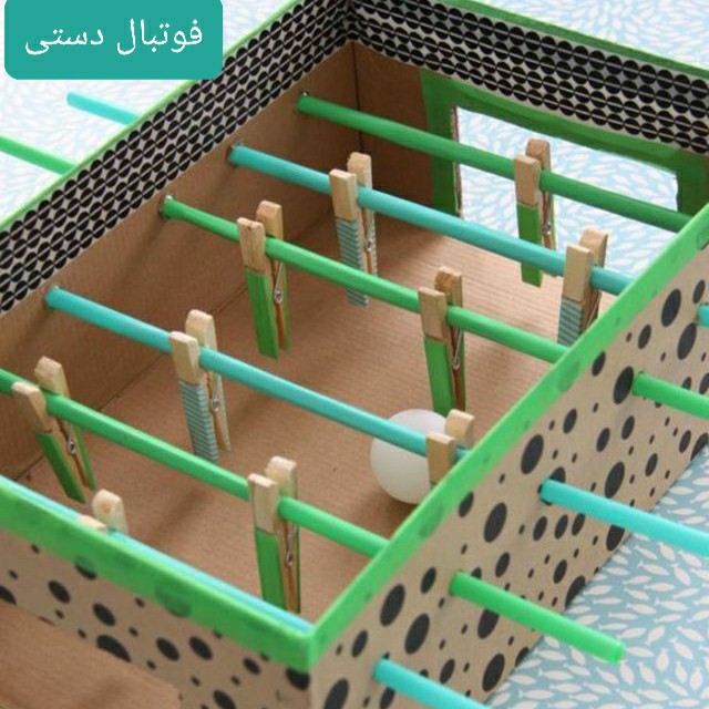 فوتبال دستی خونگی! #تقویت_مهارت_حرکتی_درشت #تقویت_هماهنگی_چشم_ودست ابزار لازم: جعبه، نی، گیره لباس، توپ پینگ پنگ یا هر توپی در سایز کوچک. فکر میکنم نحوه ساختنش با توجه به تصویر مشخصه و نیاز به توضیح نداره 😉