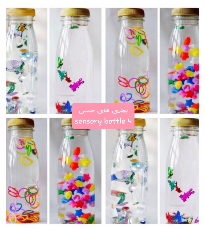 (ورق بزنین) (Sensory bottle) بطری های حسی #تقویت_حواس #بازی_حسی گروه سنی: ۳ ماه به بالا در مورد سنسوری بگ ها قبلا با هم صحبت کردیم. این بار میخوایم، یه بازی جذاب و فوق العاده ساده ی دیگه از همین دسته رو باهم ببینیم و بسازیم. ابزار لازم: بطری شفاف، چسب، آب یا روغن، و هرچیز ریزی که دارین( مثل حبوبات، کش های پلاستیکی رنگی، پوم پوم های ریز، سنگ های تزئینی، اسباب بازی های ریز و ...) بطری آب معدنی با هر بطری شفاف دیگه رو تمیز کنین و برچسب روش رو بکنین. بعد مواد یا وسایل ریز رو با کمک قیف داخل بطری بریزین و روش آب بریزین. حالا در بطری رو با چسب محکم کنین تا آب بیرون نریزه یا در بطری باز نشه. با تکان دادن بطری، مواد ریز داخل آب شروع به حرکت میکنن و بچه ها کلی سرگرم میشن. سعی کنین از وسایل رنگی استفاده کنین تا بینایی کودک تحریک و تقویت بشه. با بطری ها هم مثل سنسوری بگ ها، میشه انواع محیط (برگ های پاییزی، اقیانوس و...) یا فصول سال و ... رو بازسازی کرد و از این طریق تجربه محیطی کودک رو افزایش داد برای تقویت شنیداری کودک، میتونین آب رو حذف کنین و فقط مواد یا وسایل ریز مثل حبوبات رو داخل بطری بریزین. با تکان دادن بطری ها و برخورد مواد با دیواره بطری، انواع صداها ایجاد میشه که برای کودک جذابه.😍