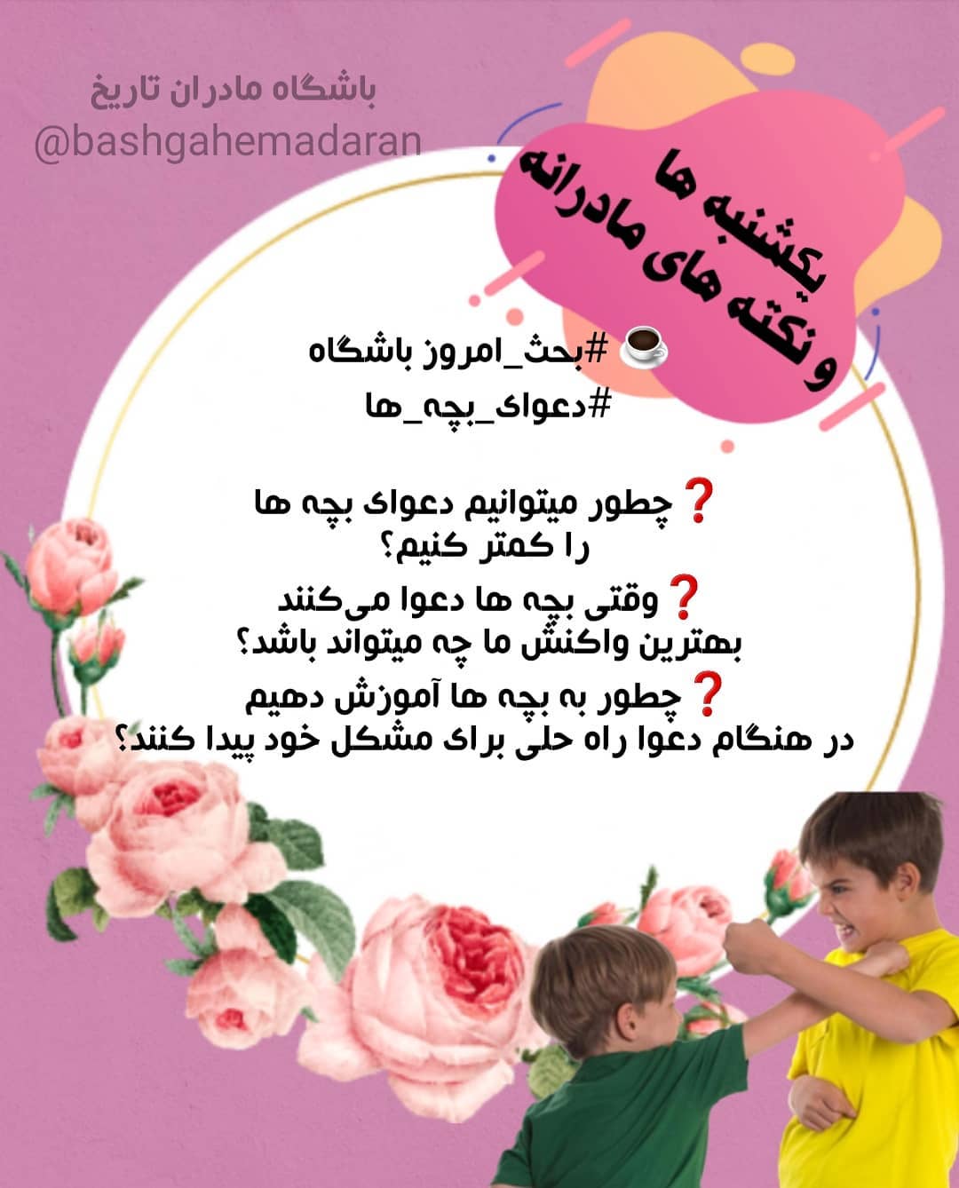 #خلاصه_نکات بحث #دعوای_بچه_ها 💟بی توجهی به دعوای بچه ها در بیشتر مواقع 😊 💟گذاشتن قانون در رابطه با استفاده از وسایل مثل اینکه در صورت دعوا بر سر یک وسیله مشترک ؛ اون وسیله جمع میشه🤦♀️ 💟پذیرش این موضوع که دعوا متعلق به همه بچه ها هست و یک امر طبیعی و لازمه ی دوره رشد بچه ها هست .👶👶 💟در دعوا سعی کنیم از هیچ کدام از بچه ها جانب داری نکنیم و همه اونها رو مخاطب قرار بدهیم.👩👧👦 💟سعی کنیم در دعوای بین بچه ها با بیانات تلقینی حس محبت و احترام بین هر دو رو تقویت کنیم.👫 💟 درباره بچه های زیر دوسال با صرف توجهاتی میشه بیشتر طرف بزرگتر رو بیگیریم بدون دعوا کردن بچه کوچیکتر (مثلا تو مو کشیدن : الهی بمیرم مامان چقدر دردت اومد وای چند تا از موهات هم کنده شده دیروز موهای منم کَند خیلی درد داشت ) همین مطلب باعث میشه حتی اگه بازیشون رو خراب میکنه دعواش نکنن حواسش رو پرت کنن یا از مادر کمک بگیرن 👌 💟پسر ها هرگز نباید بیکار باشن وگر نه برای سرگرمی دعوا راه میاندازن 😁 💟بنا بر سن بچه ها صحبت کردن و راضی کردن همدیگر را به جای دعوا کردن بهشون آموزش بدیم. بگید برامون شما چطور با دعوای بچه ها برخورد میکنید؟؟ #شنبه_های_باشگاه #دعوای_بچه_ها #باشگاه_مادران_تاریخ #معرفی_کتاب #کتاب_خواهران_و_برادران_به_دور_از_حسادت_و_با_ارامش #کتاب_خواهر_برادر_های_سازگار